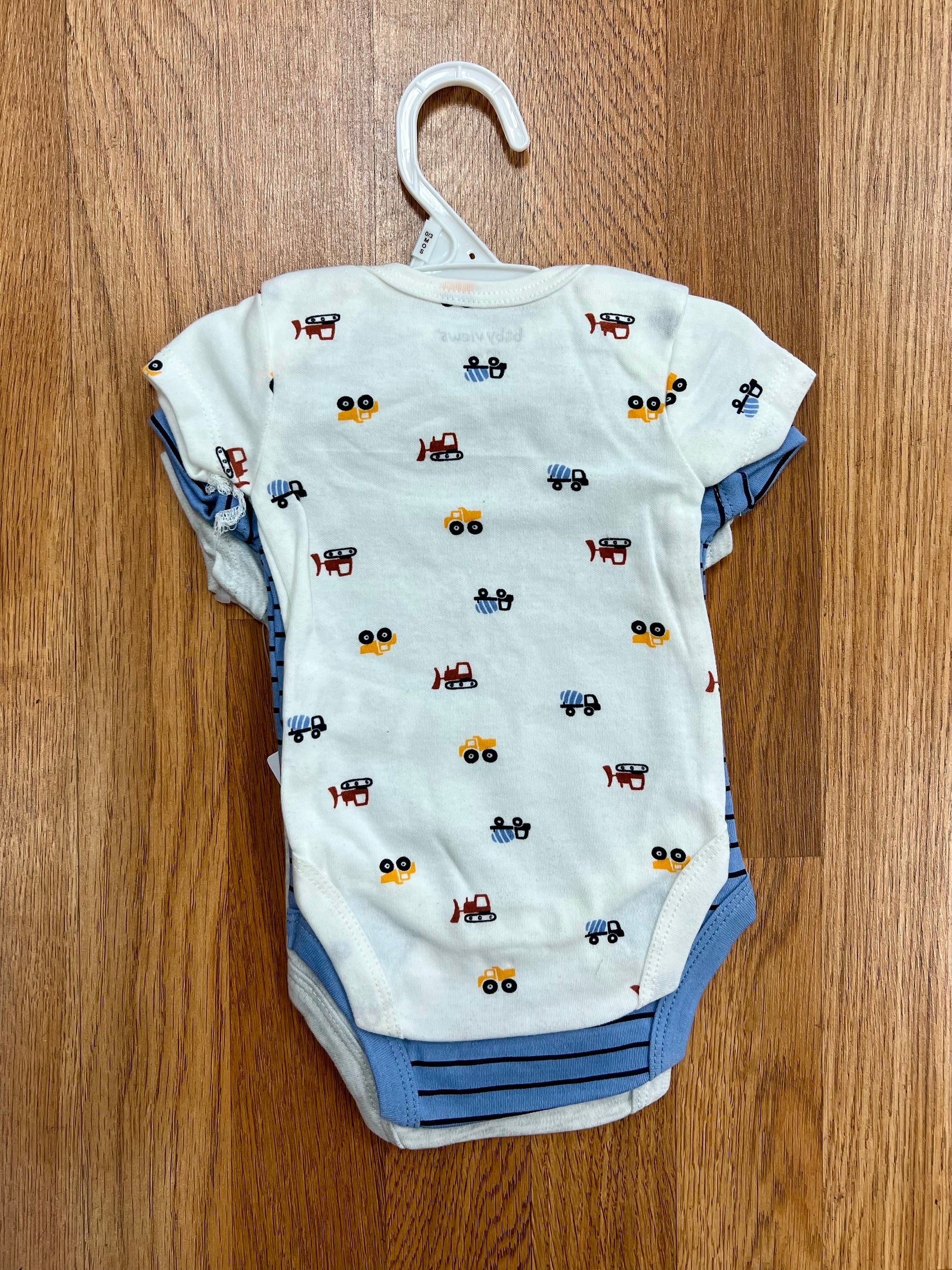 This 3 Pack Onesies-Cars features adorable construction car graphics with soft cotton blend fabric and convenient snap-bottom closures that bring comfortable versatility to any baby's wardrobe. The pack includes one heather grey bodysuit with colorful "Loads of Fun" construction truck graphics, one classic ivory bodysuit, and one denim blue striped bodysuit, creating easy everyday style with multiple mix-and-match options, while the short sleeves and crew necklines add timeless appeal perfect for year-round wear.