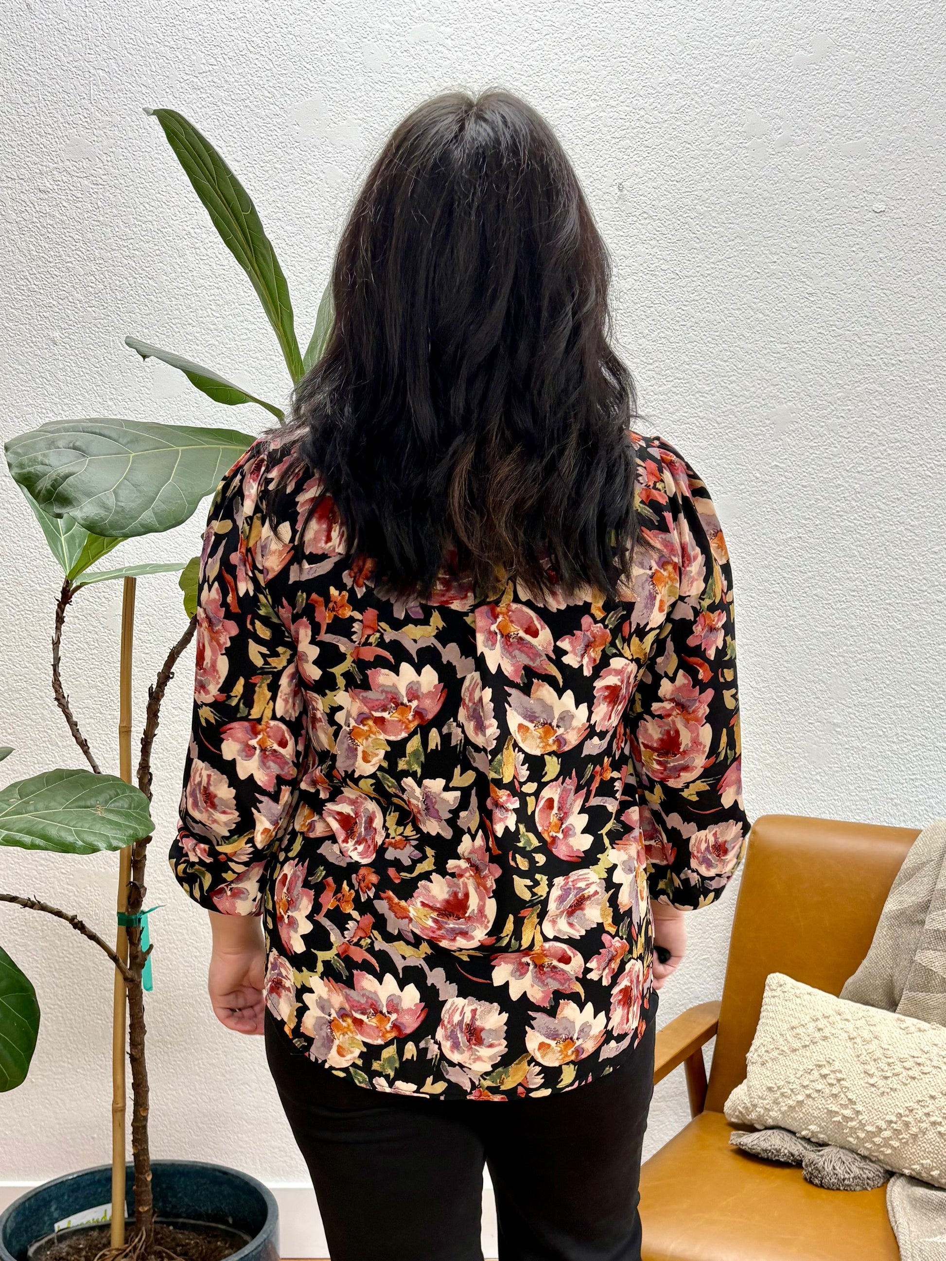 The striking floral contrast against the black background and vintage-inspired pattern make it perfect for pairing with neutral trousers for professional settings or styling with dark jeans and heels for elevated evening looks that feel both timeless and contemporary.