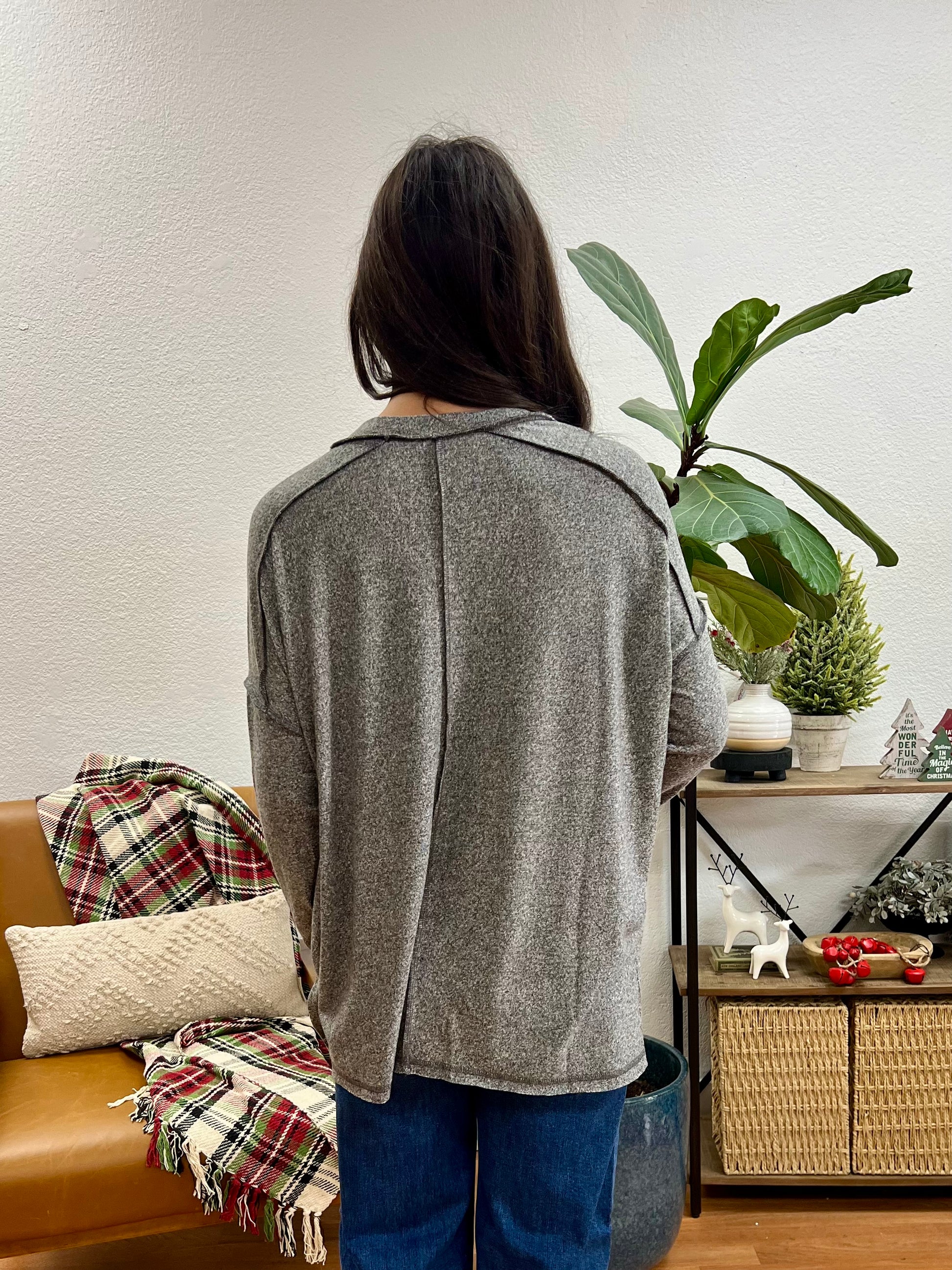 The neutral heathered finish pairs seamlessly with any color palette and hides minor imperfections, while the brushed hacci fabric feels incredibly soft against skin and the relaxed silhouette ensures unrestricted movement, making it perfect for those seeking a comfortable wardrobe essential that combines casual style with luxurious fabric comfort for everyday wear.