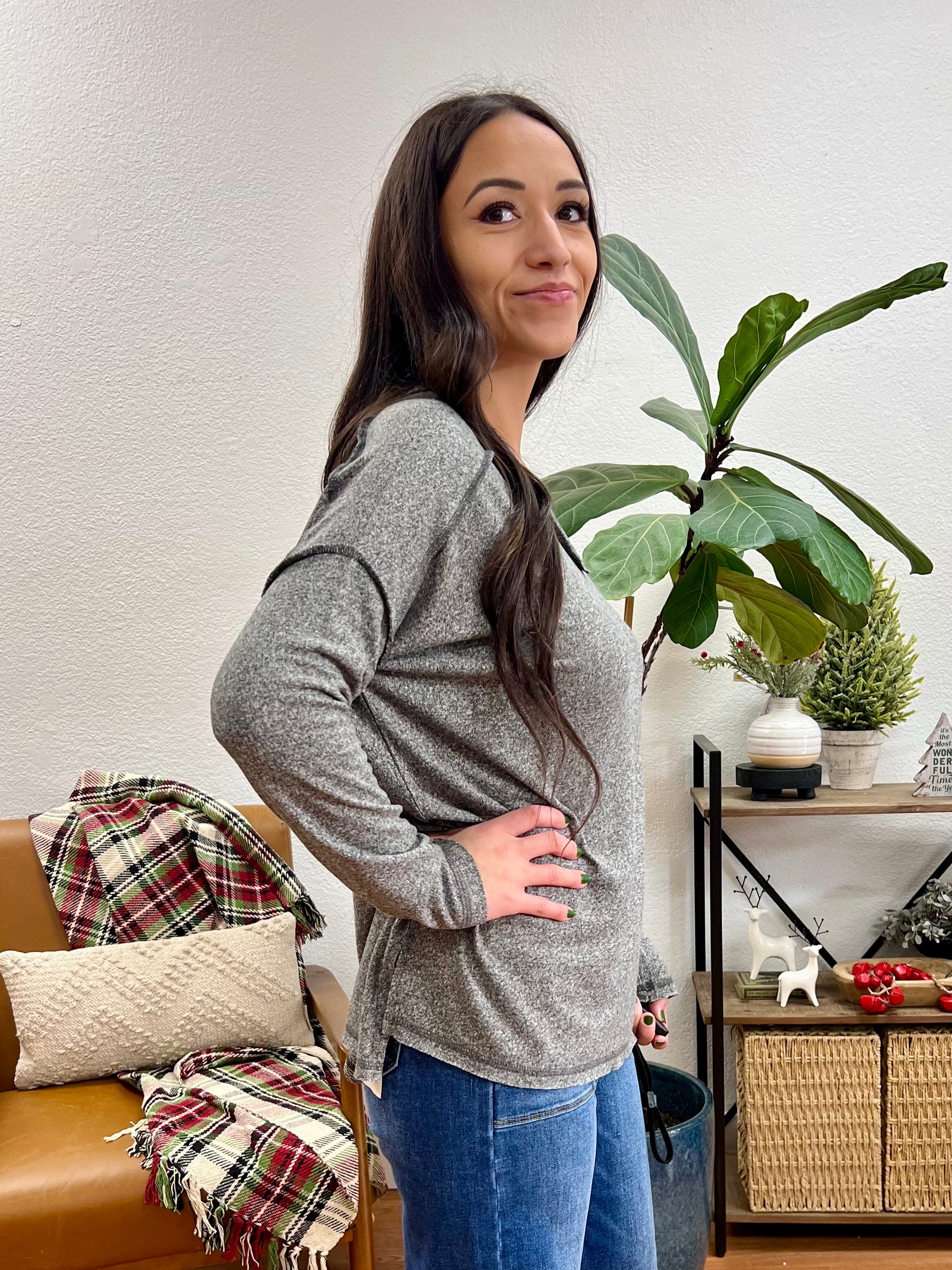 This Black Melange Hacci Long Sleeve Tee features a heathered charcoal gray tone with soft brushed hacci knit fabric and relaxed V-neckline that brings cozy comfort to any casual wardrobe. The lightweight yet warm construction and classic long sleeves create easy layering style, while the flattering V-neck and relaxed fit add versatile appeal perfect for everyday wear.