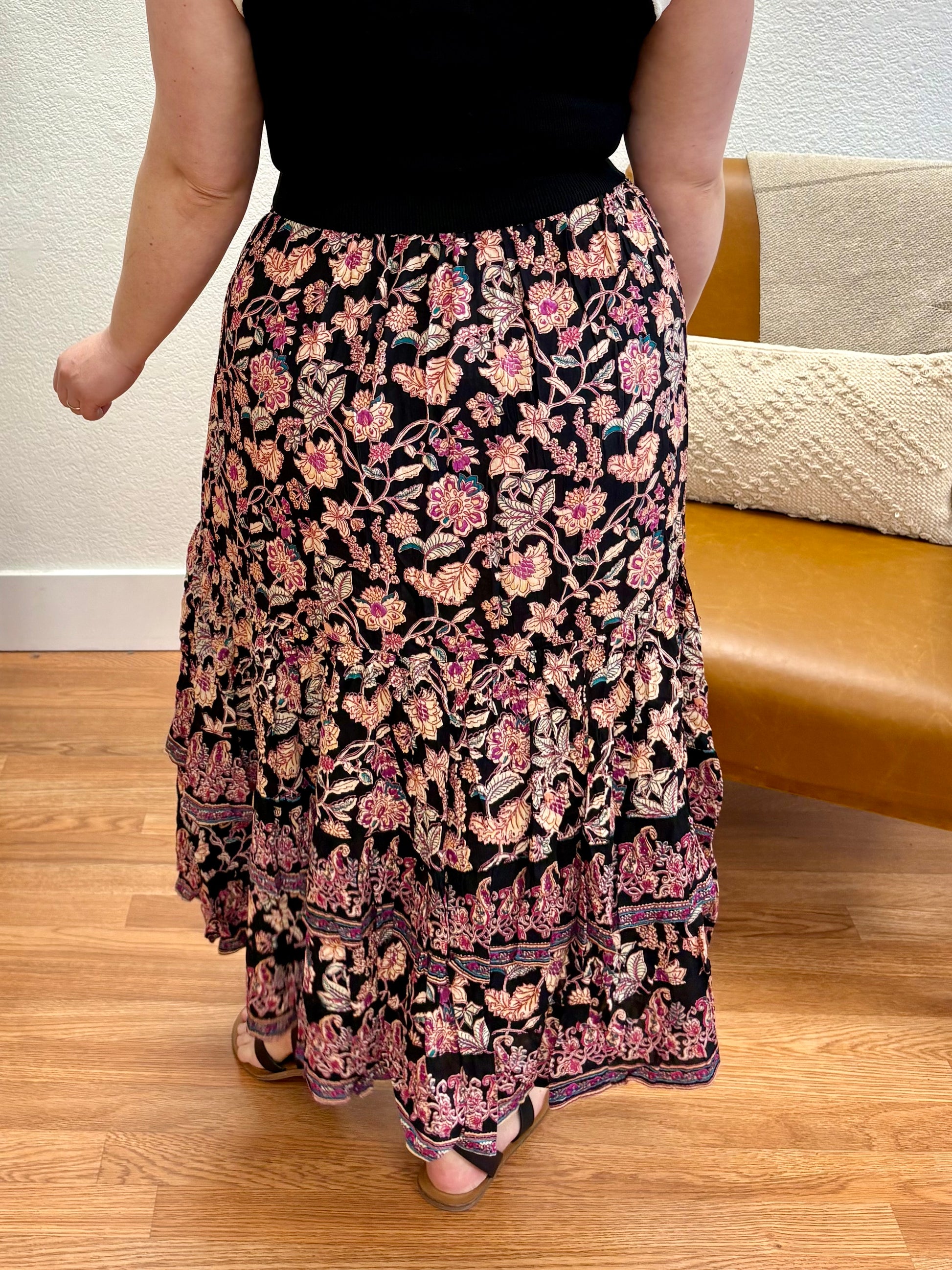 This Black Printed Maxi Skirt showcases intricate artistry with flowing bohemian elegance.