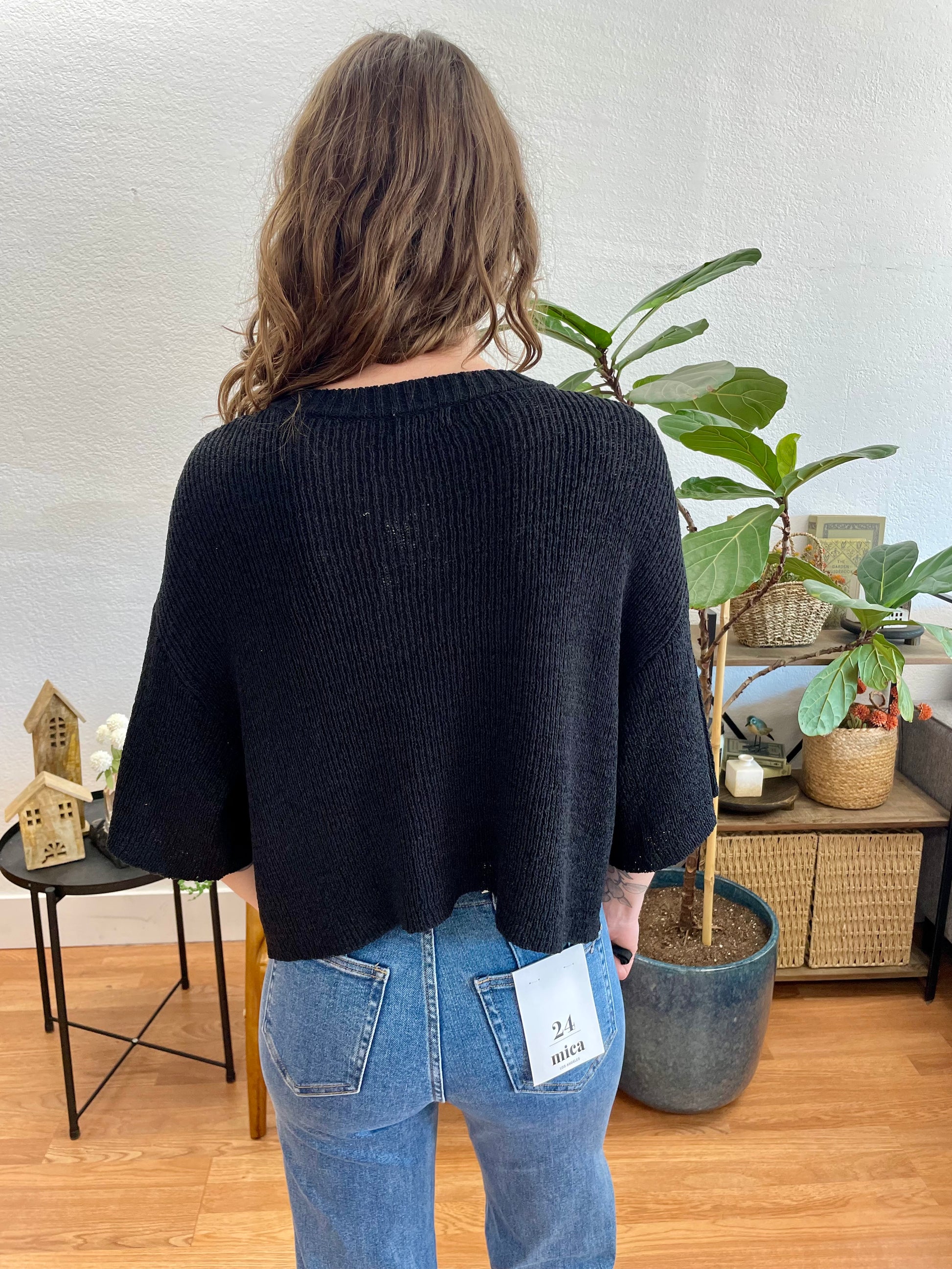 The Black Short Sleeve Cardigan is the same beautifully relaxed silhouette as the Ivory version, this time in a deep, versatile black that makes it an instant wardrobe anchor. The soft, lightly textured knit fabric has a cozy, comfortable quality, while the full button-front placket with dark tonal buttons keeps the look sleek and cohesive from top to bottom. The relaxed scoop neckline and cropped three-quarter sleeves create a silhouette that feels effortlessly polished without any extra effort.