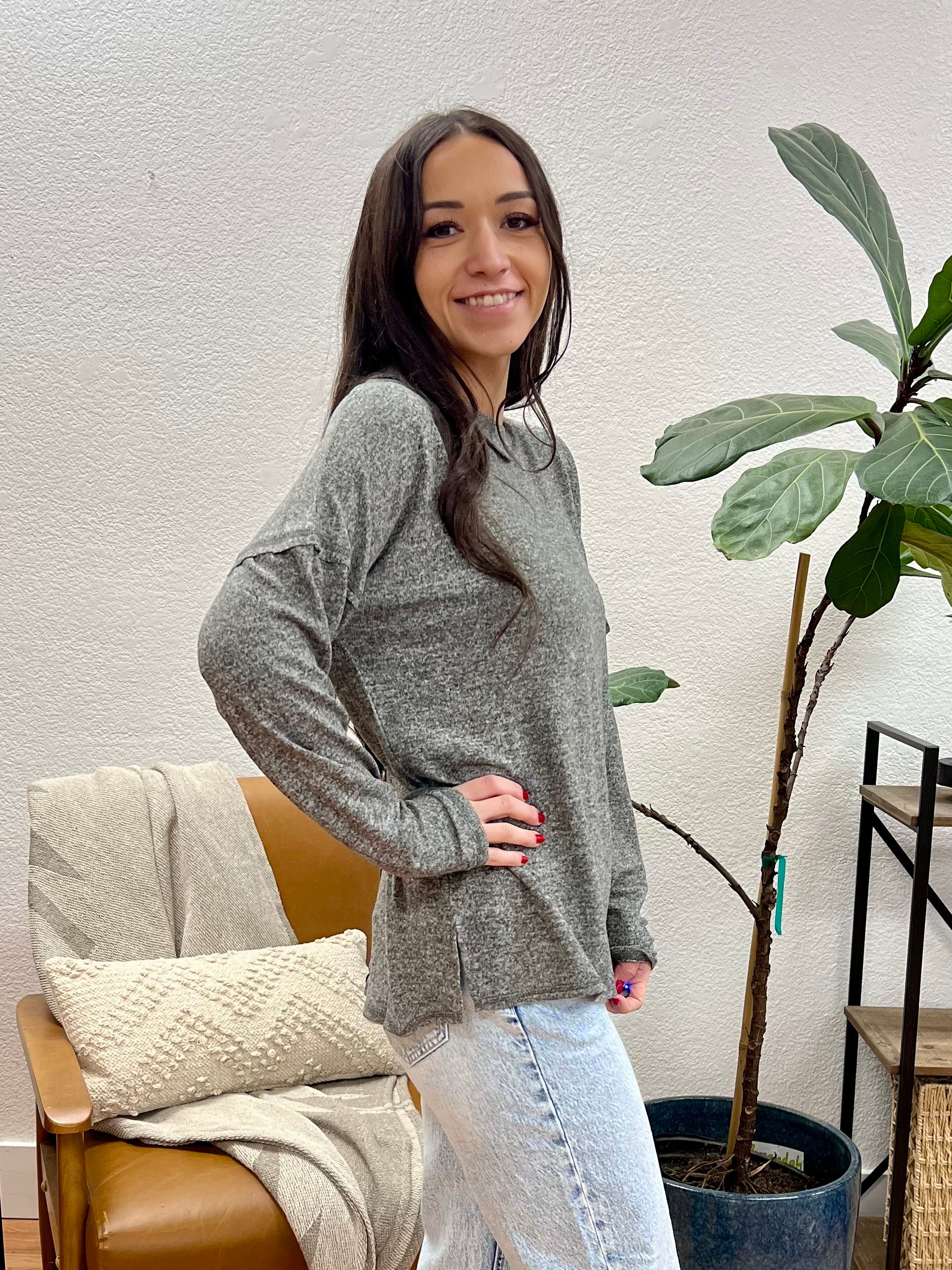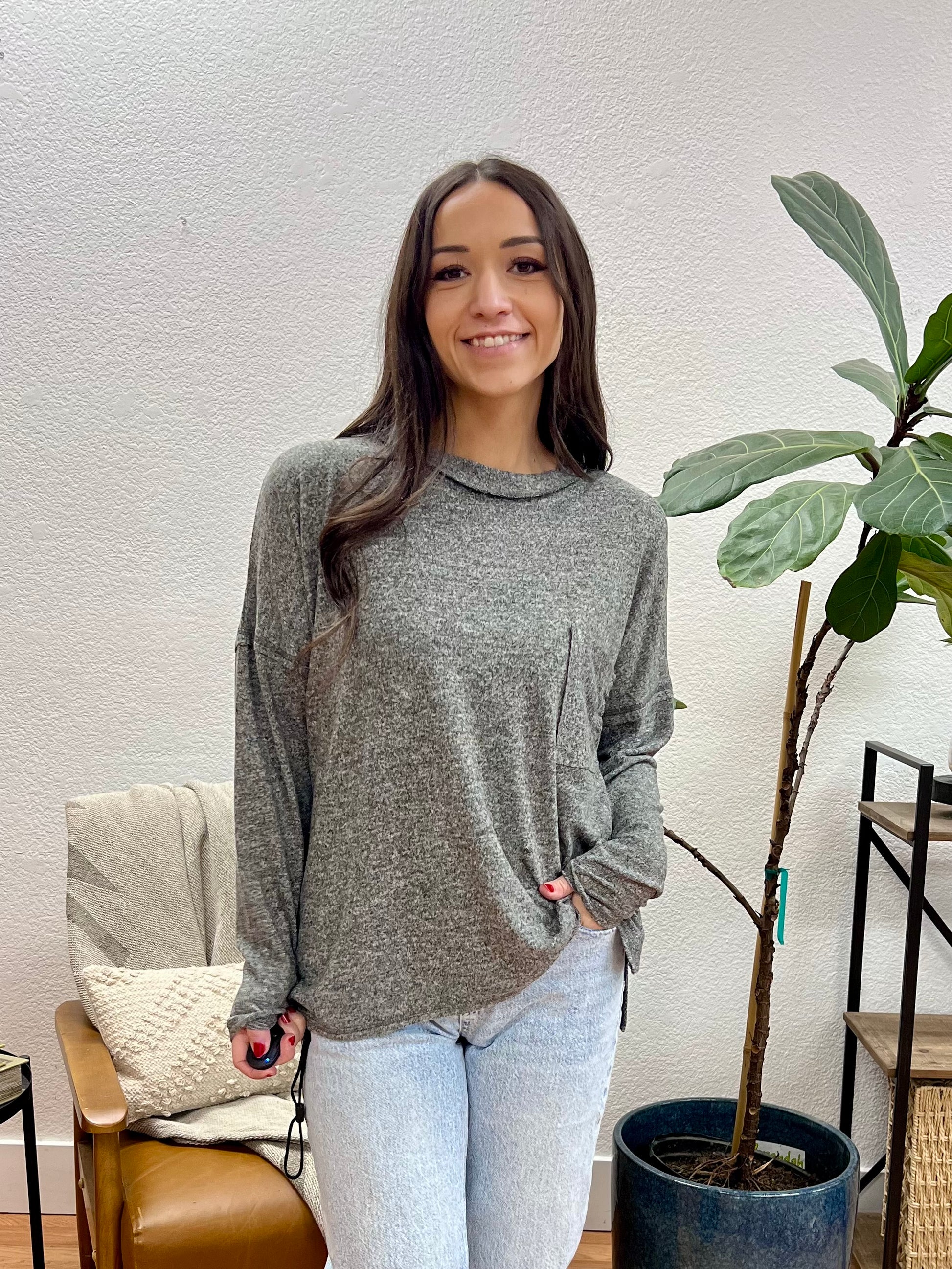 This Black Soft Melange Pocket Tee features a charcoal grey heathered hue with cozy melange knit construction and classic crew neckline that brings comfortable versatility to any casual wardrobe. The relaxed oversized fit and plush heathered fabric with functional chest pocket create easy everyday style, while the long sleeves and slightly longer hemline add contemporary appeal perfect for year-round layering.