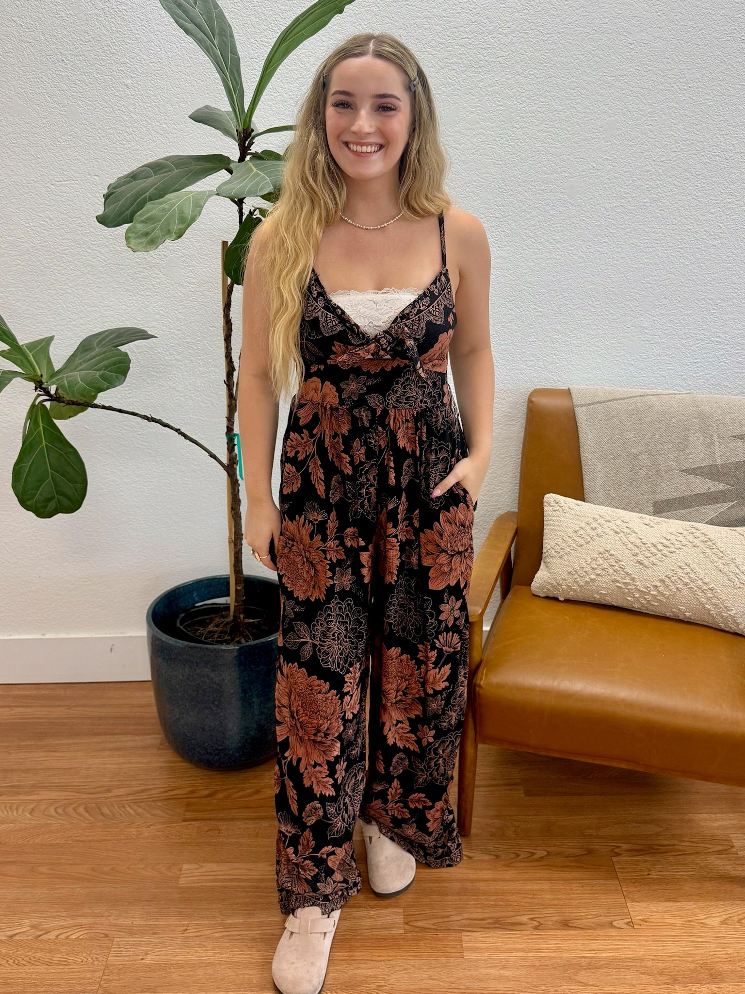 The Black Floral Tie Wide Leg Jumpsuit brings bohemian elegance to your wardrobe, featuring a rich black base adorned with rust and coral floral motifs and adjustable tie straps with flowing wide leg silhouette that creates effortless one-piece sophistication with romantic appeal.