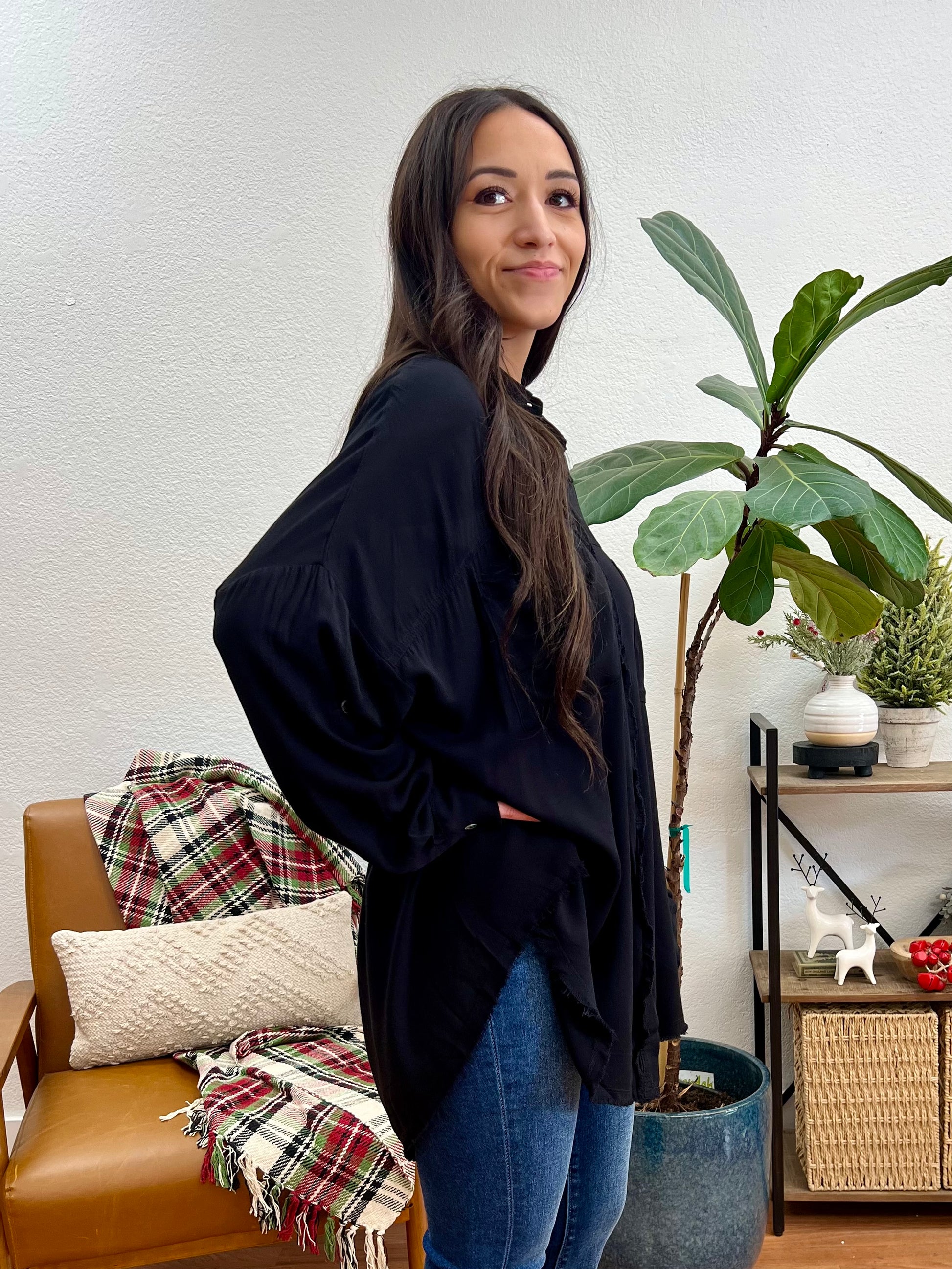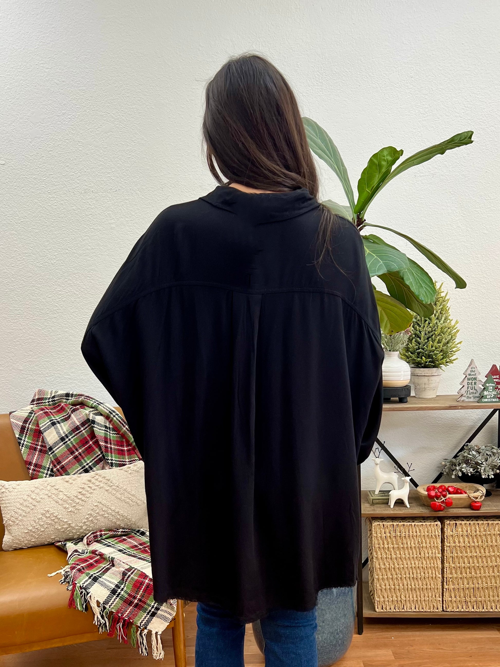 This Black Washed Distressed Top features a deep black hue with relaxed oversized button-down silhouette and soft washed finish that brings effortless edge to any casual wardrobe. The classic collar and button-front closure create versatile styling options, while the functional chest pocket and roomy fit add laid-back appeal perfect for everyday wear.