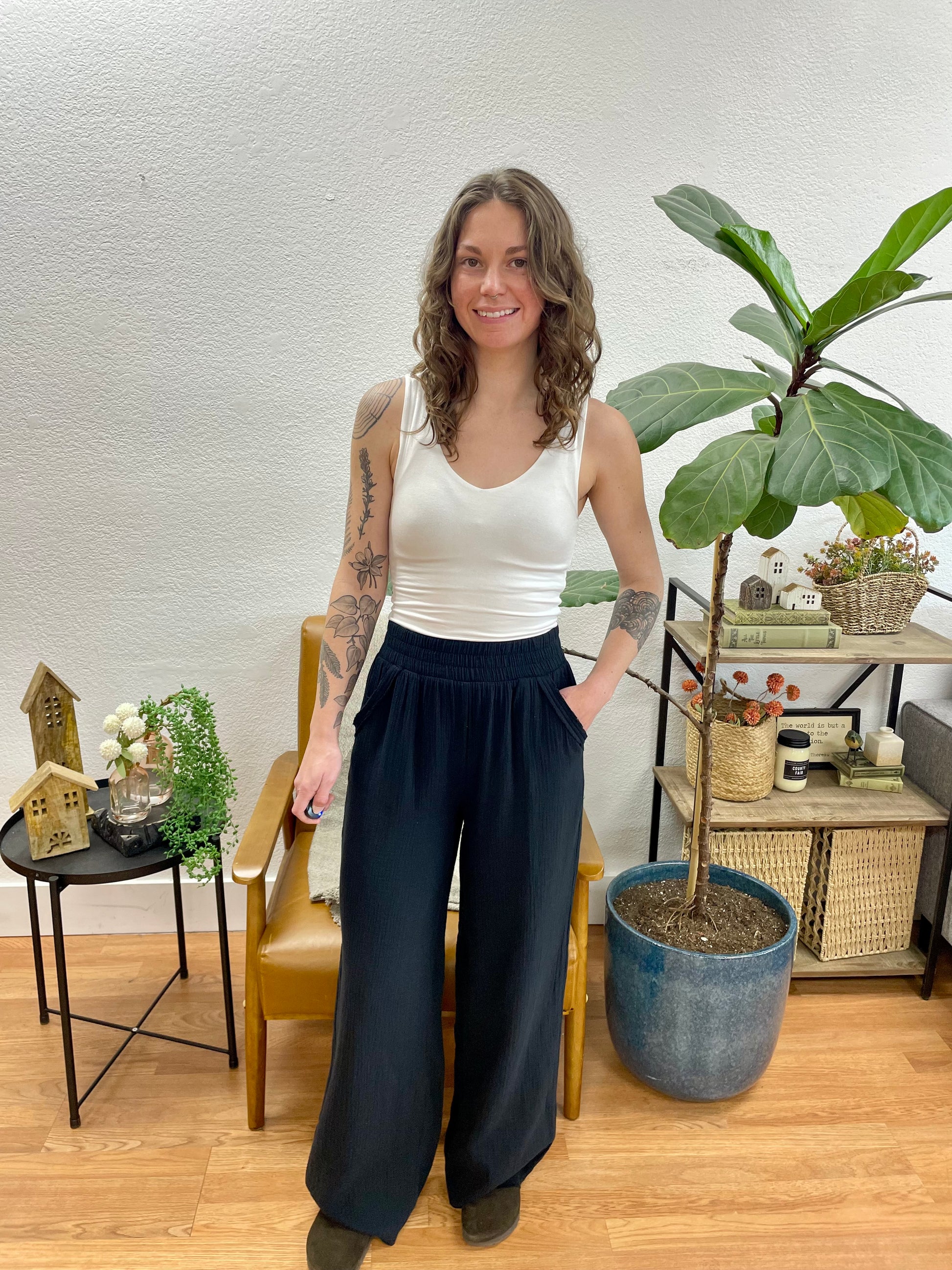 The airy gauze material feels weightless against your skin while maintaining enough structure to drape gracefully. The full-length cut and generous leg width create elegant proportions that work for various heights and body types. The rich black shade offers versatile styling options while the relaxed fit ensures all-day comfort.