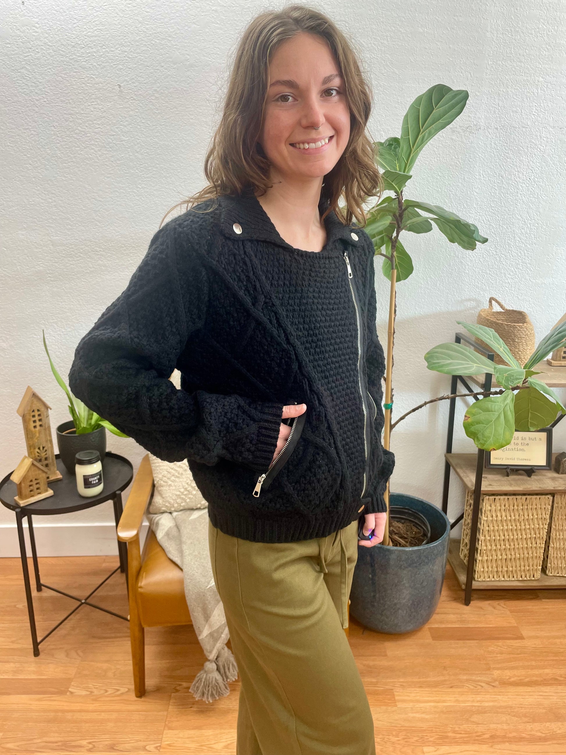 This Black Zip Up Knit Jacket reimagines classic bomber styling with cozy textured knit construction and modern edge. The rich black fabric features dimensional waffle-knit texture that adds visual interest, while silver-tone hardware including the full front zipper, dual side zip pockets, and shoulder snap details creates bold contrast. The cropped length hits perfectly at the waist for flattering proportions, and the ribbed hem and cuffs provide comfortable structure that holds its shape.