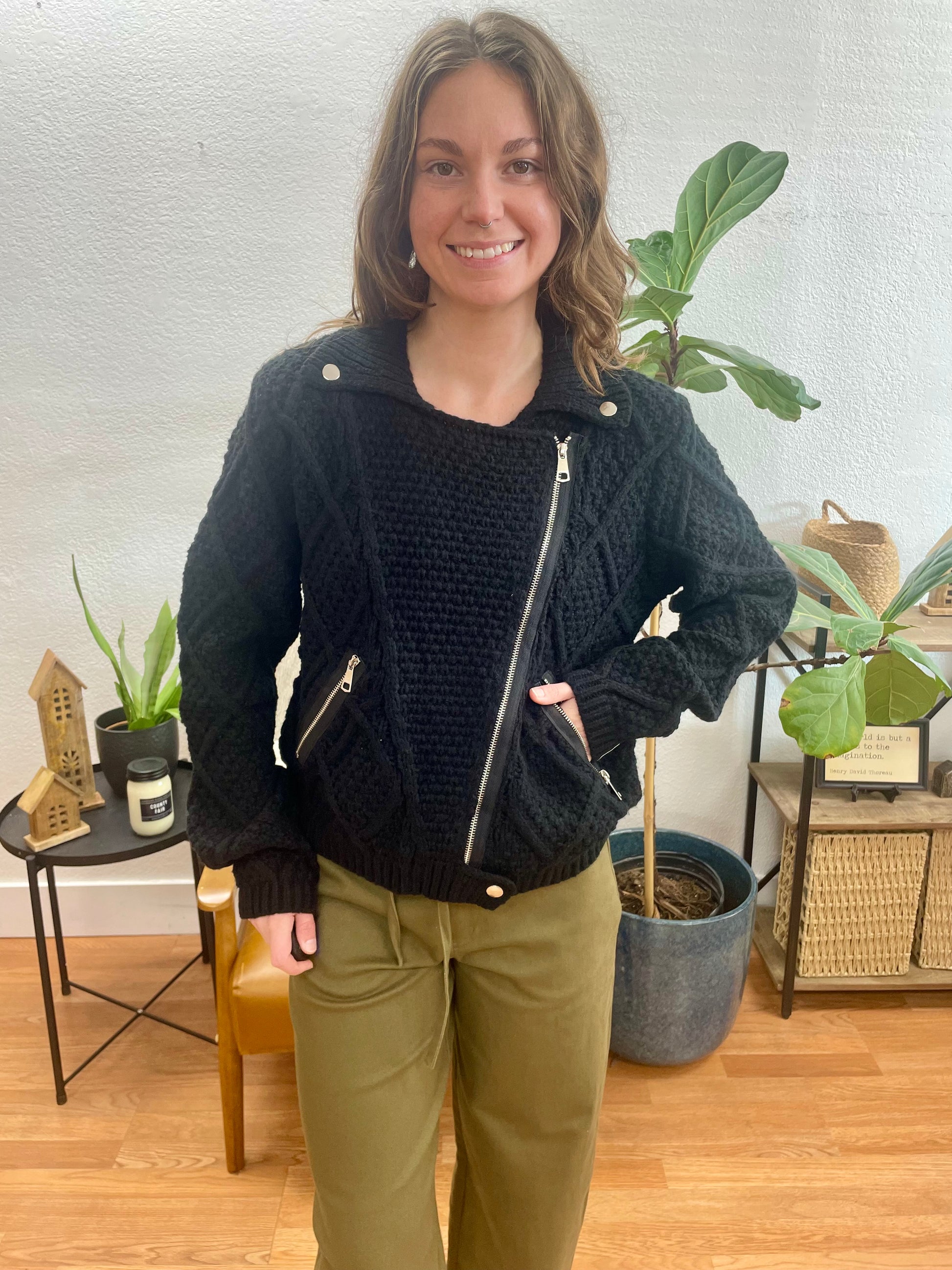 The substantial knit fabric offers warmth without the weight of traditional jackets, making this piece ideal for transitional seasons and layering throughout the year. The moto-inspired details add urban cool while the soft knit construction keeps comfort at the forefront.