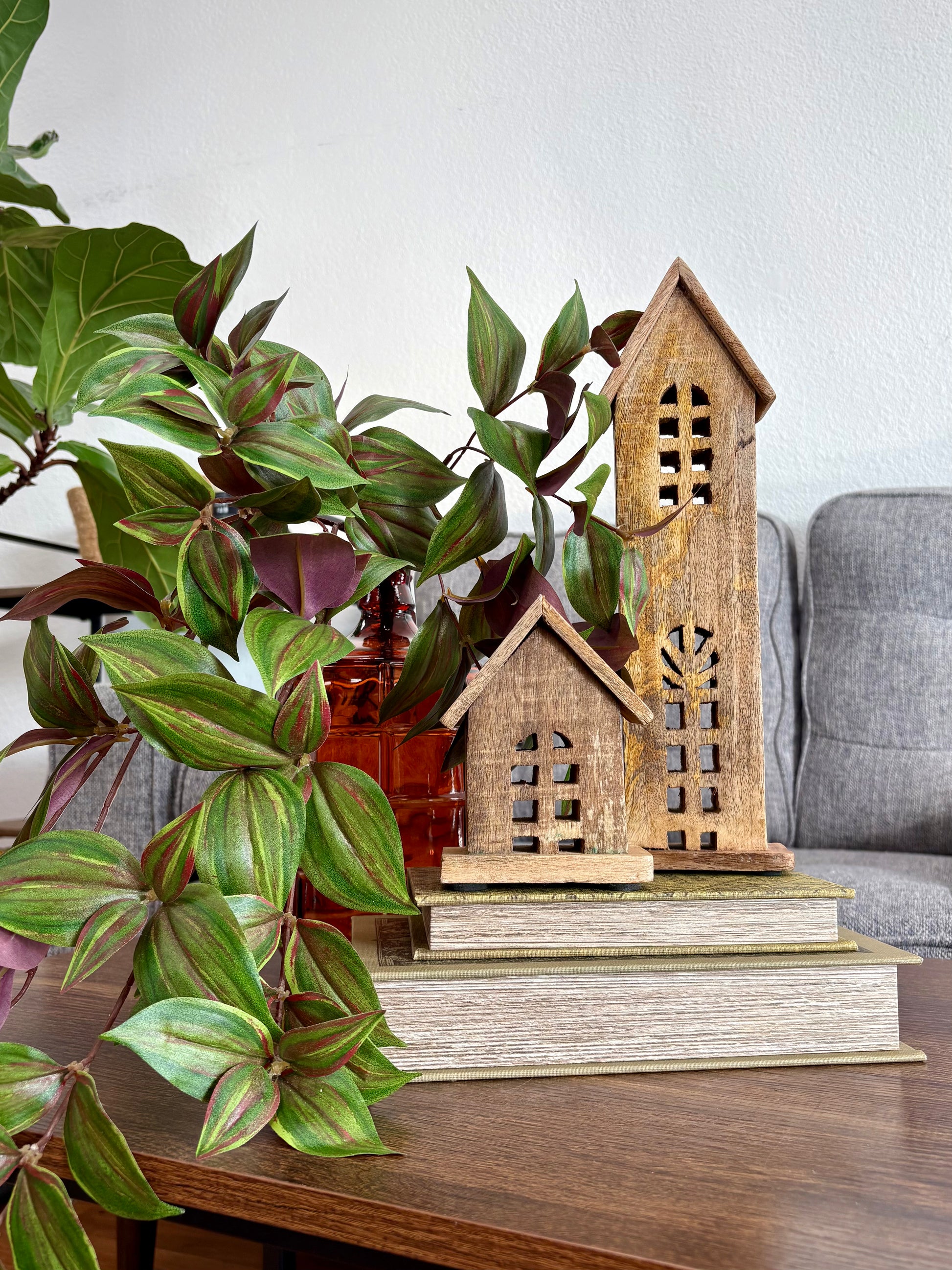 - 2x Carved Mango Wood House in Extra Small & Large (cottage contrast and height)