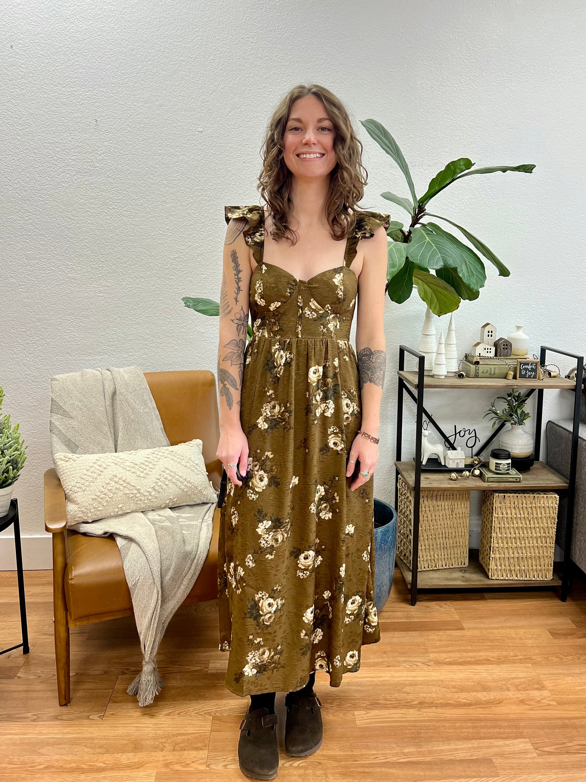 The earthy olive-brown tone with soft floral detailing serves as a perfect wardrobe staple that pairs beautifully with any accessories, while the smocked bodice ensures a flattering fit and the midi-length skirt adds elegant movement, making it perfect for those seeking a comfortable essential that combines romantic floral styling with contemporary midi dress appeal for effortless everyday elegance.