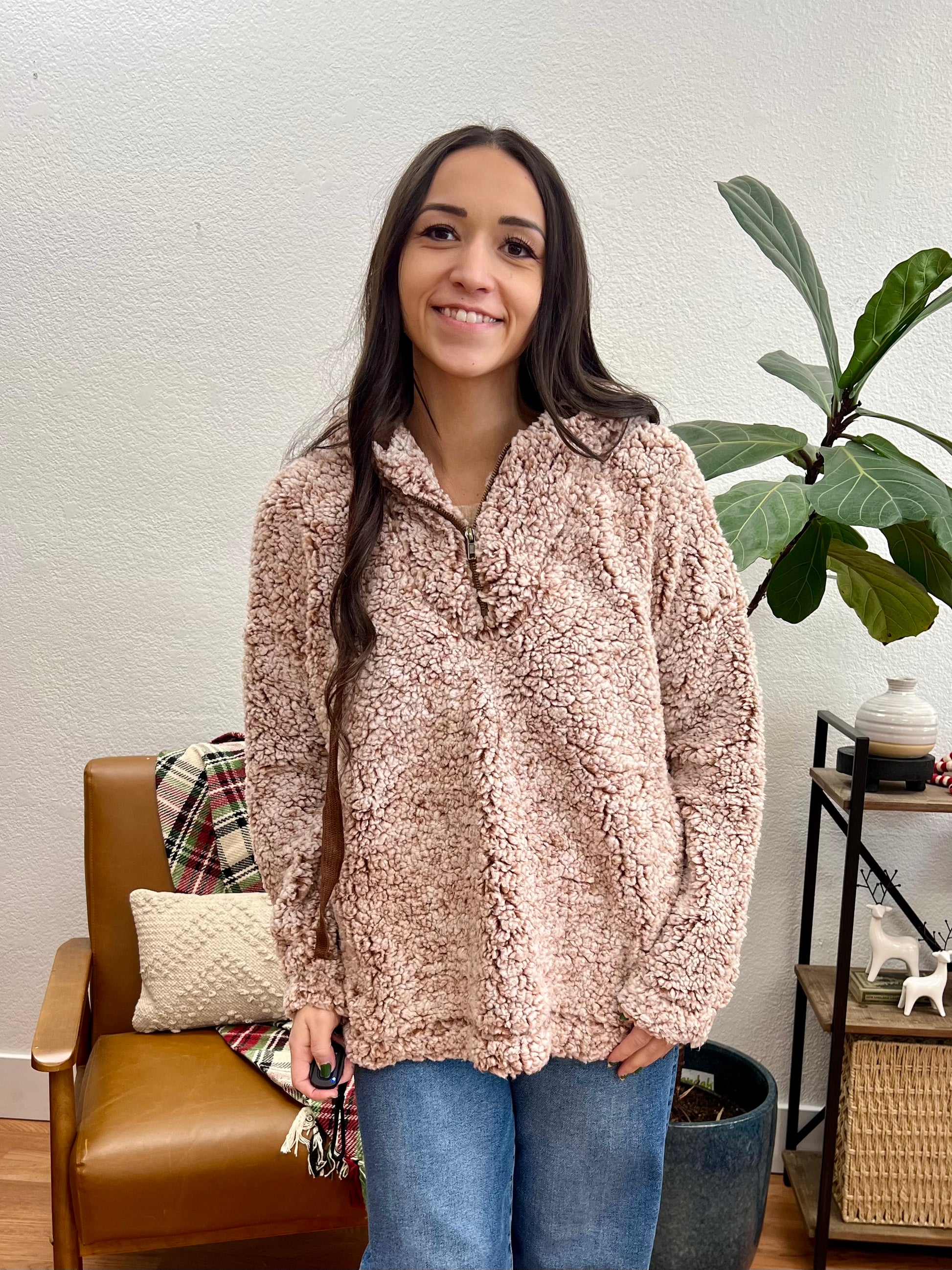 The neutral taupe-brown tone pairs effortlessly with any casual outfit in your wardrobe, while the sherpa teddy fleece feels incredibly soft and warm against skin and the oversized fit ensures unrestricted comfort, making it perfect for those seeking the ultimate cozy essential that combines luxurious sherpa comfort with relaxed pullover styling for effortless cold-weather lounging.