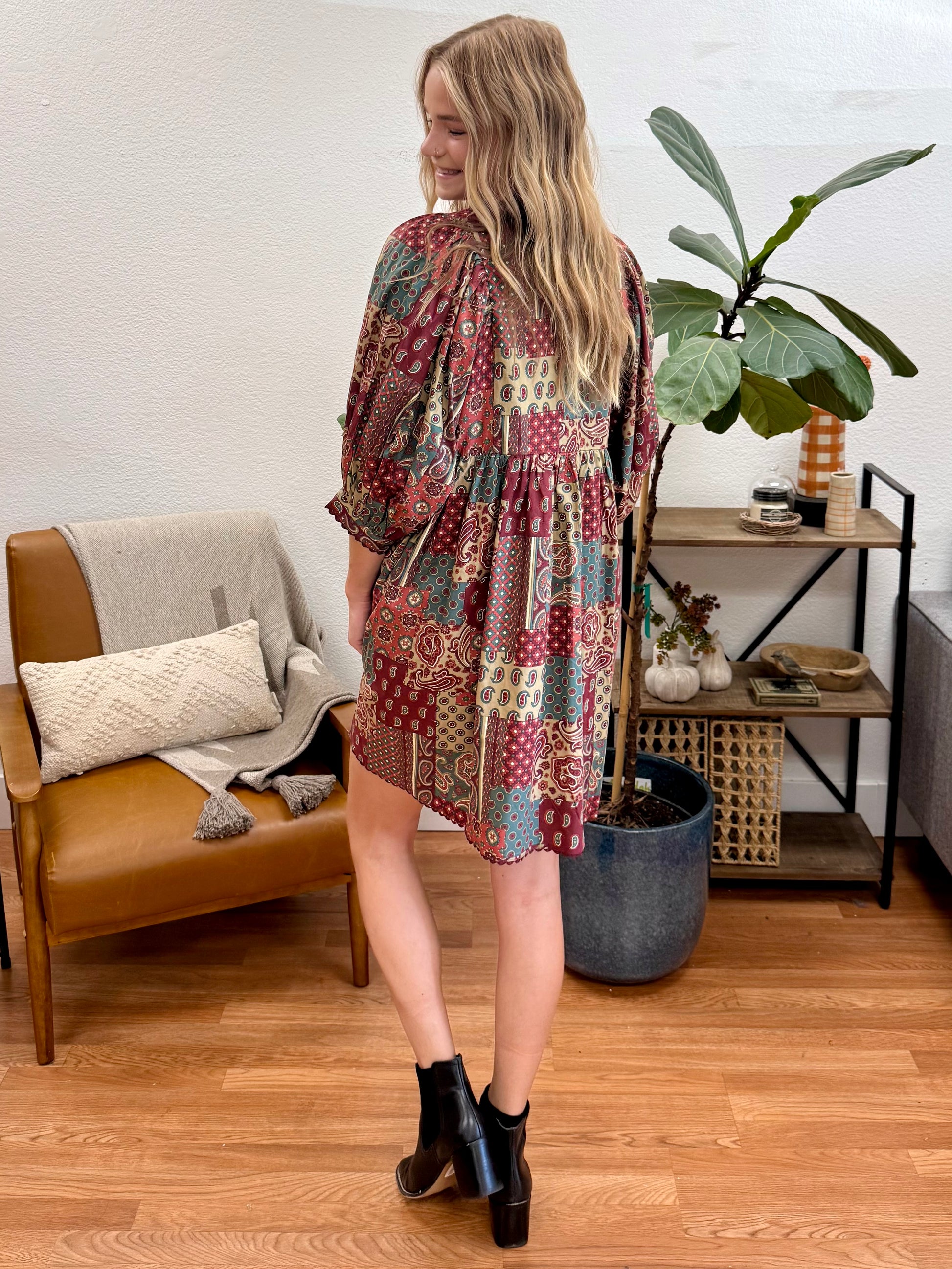 This Burgundy Paisley Mini Dress features a vibrant patchwork paisley print with a flowing babydoll silhouette and gathered details that bring bohemian charm to your wardrobe. The flattering V-neckline and billowy three-quarter sleeves create a romantic look, while the lightweight fabric and relaxed fit make it perfect for effortless style.