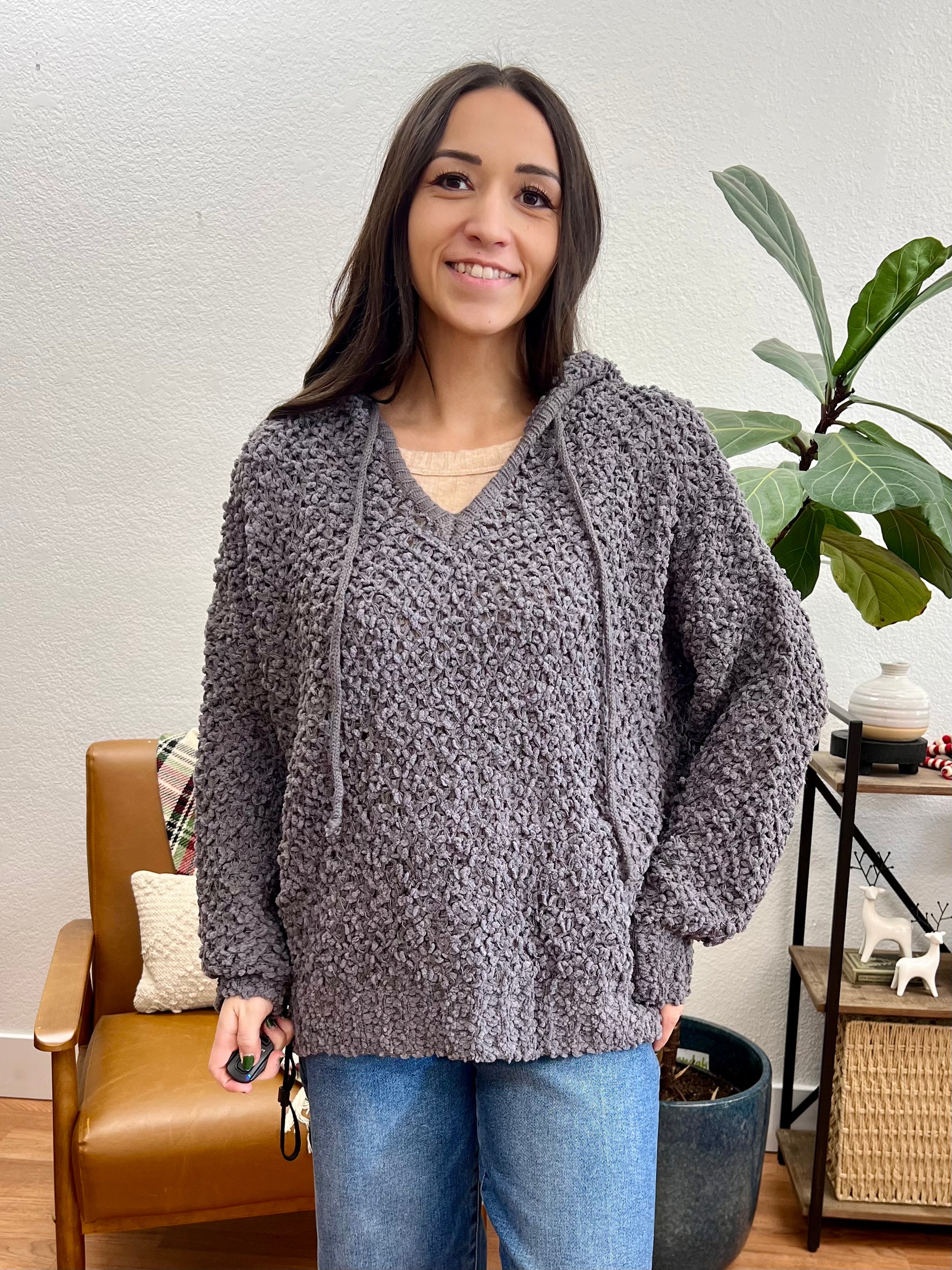 This Charcoal Popcorn Hoodie features a deep charcoal grey hue with textured popcorn knit fabric and cozy hood that brings comfortable warmth to any casual wardrobe. The oversized relaxed fit and unique nubby texture create wrap-yourself-up comfort, while the V-neckline and long sleeves add laid-back appeal perfect for lounging and everyday wear.