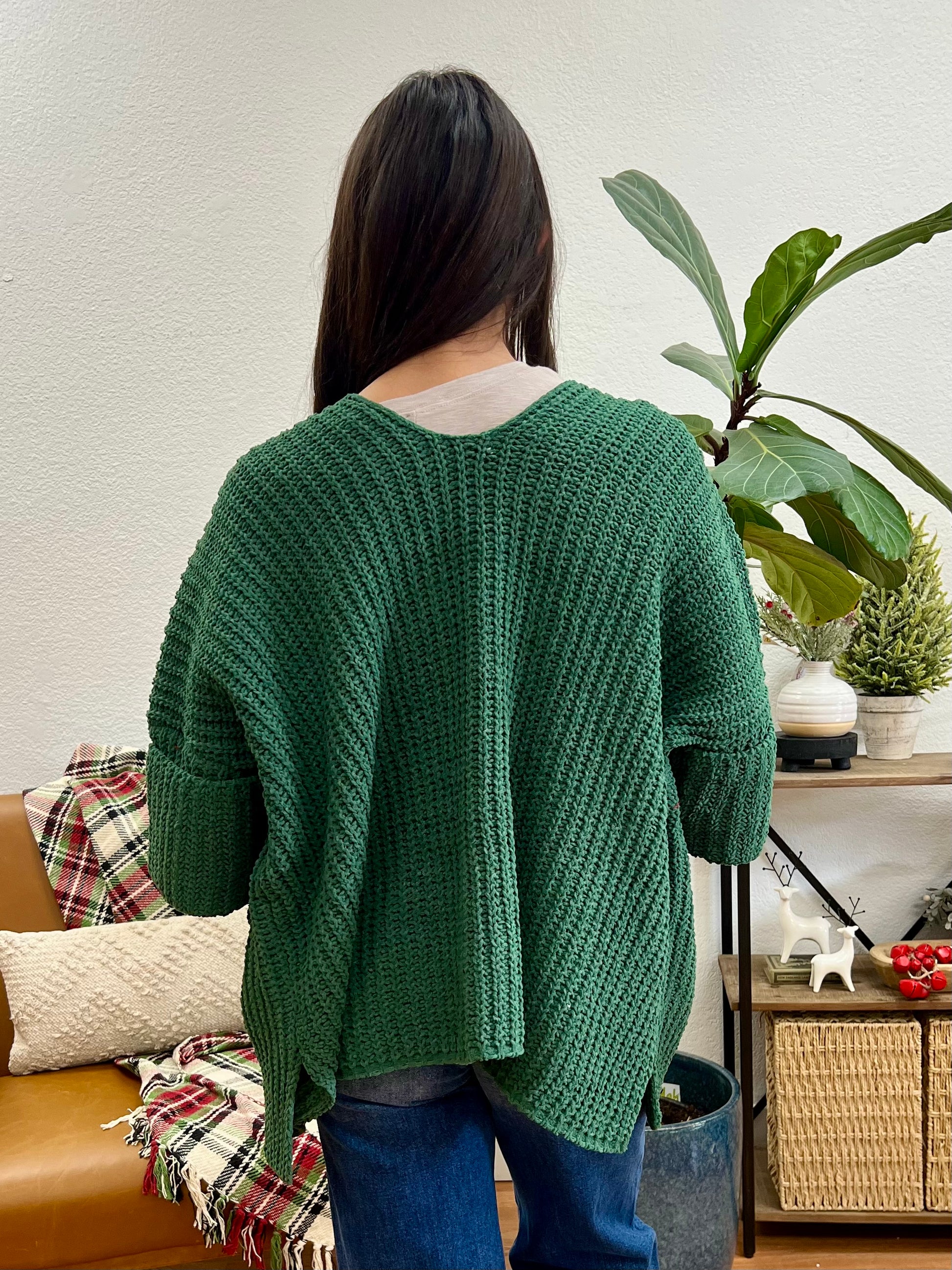 The deep green tone adds a pop of earthy color to neutral wardrobes, while the chunky knit texture creates visual interest and the roomy fit ensures all-day comfort, making it perfect for those seeking a versatile layering piece that combines casual charm with cozy functionality for everyday wear.