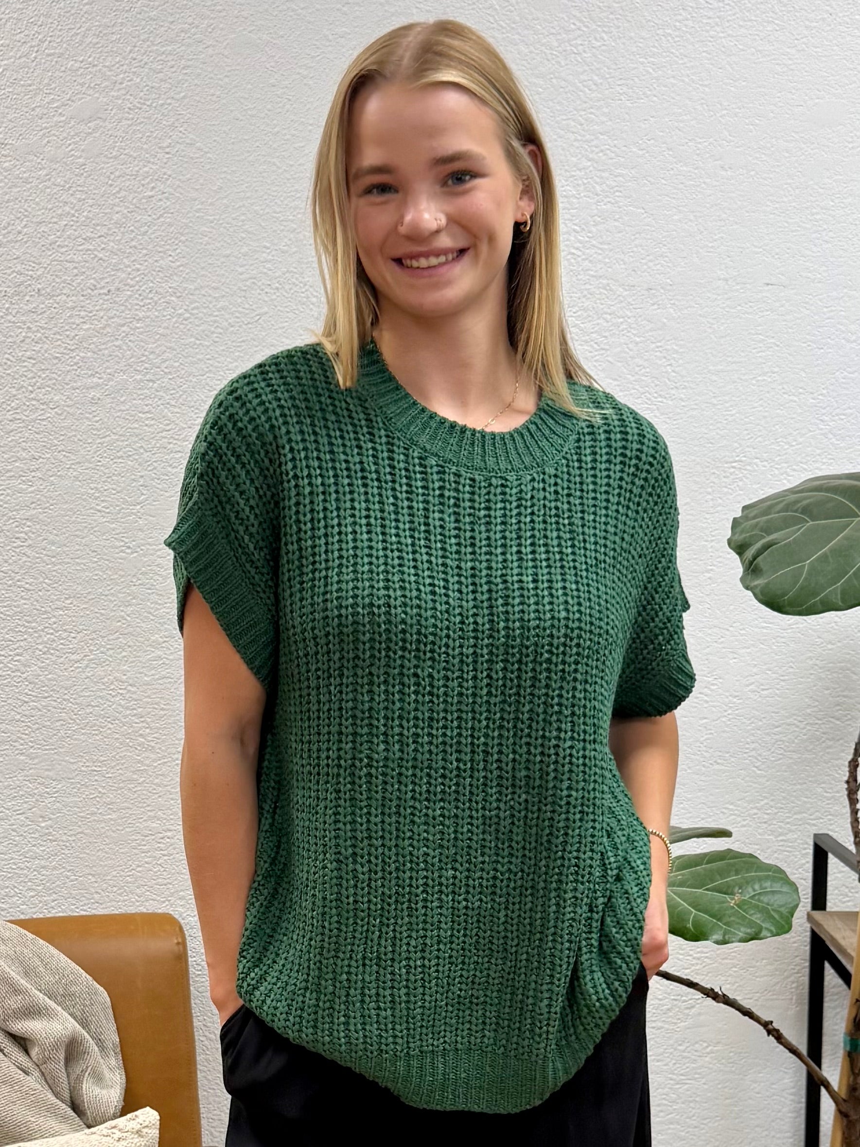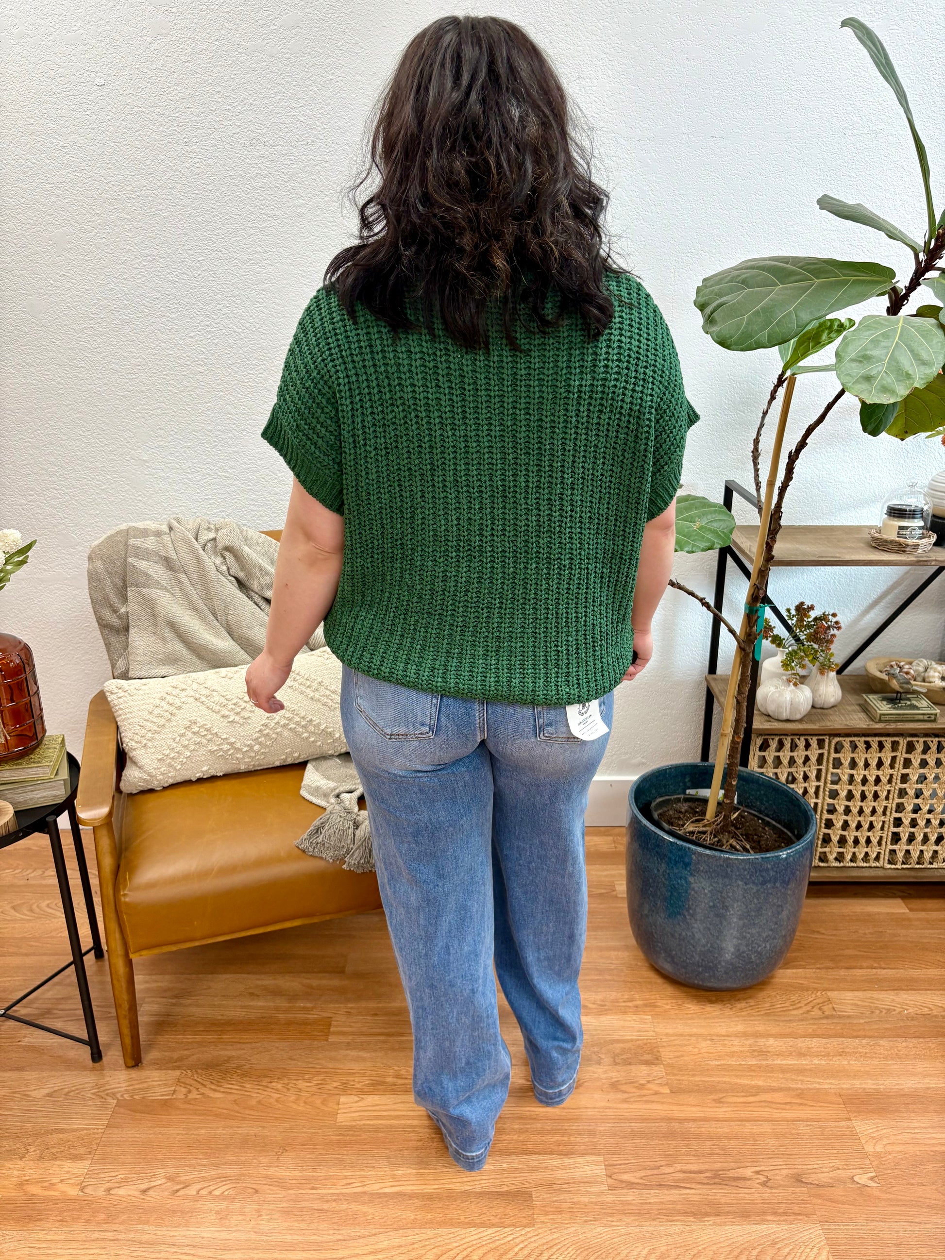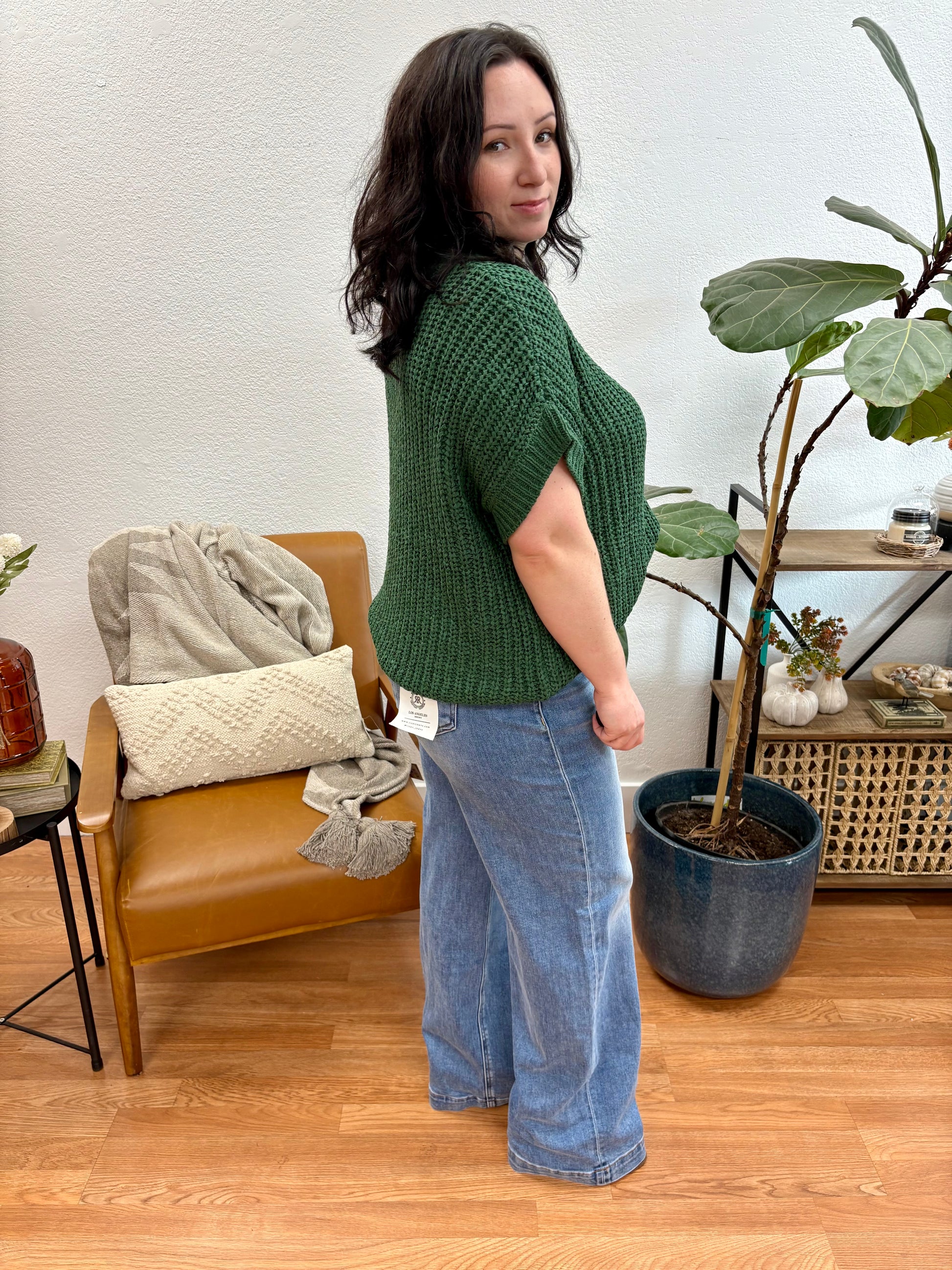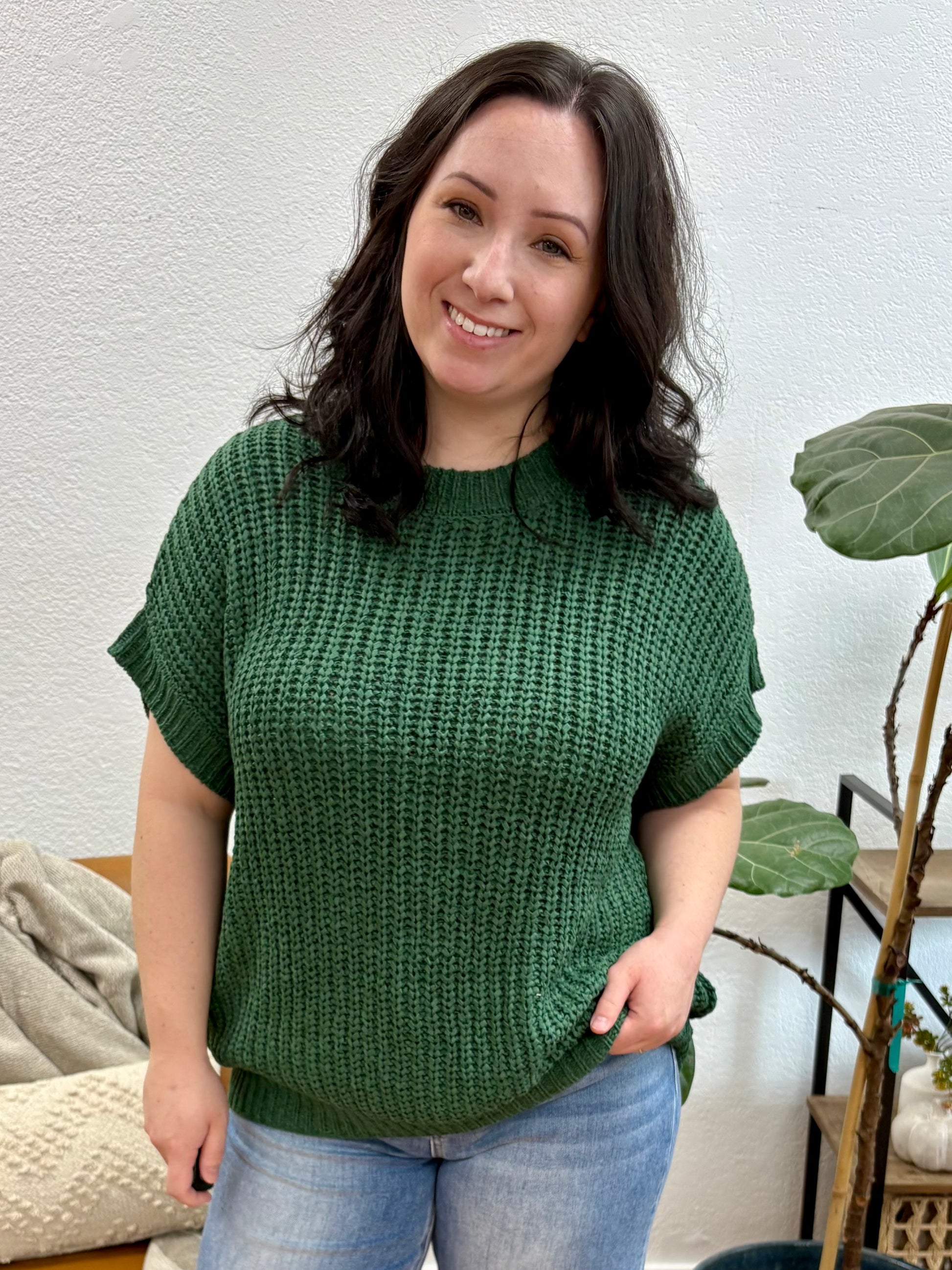 The deep green tone and chunky knit texture make it perfect for pairing with light-wash jeans for casual contrast or styling with neutral bottoms and boots for layered autumn looks that feel both grounded and effortlessly polished.