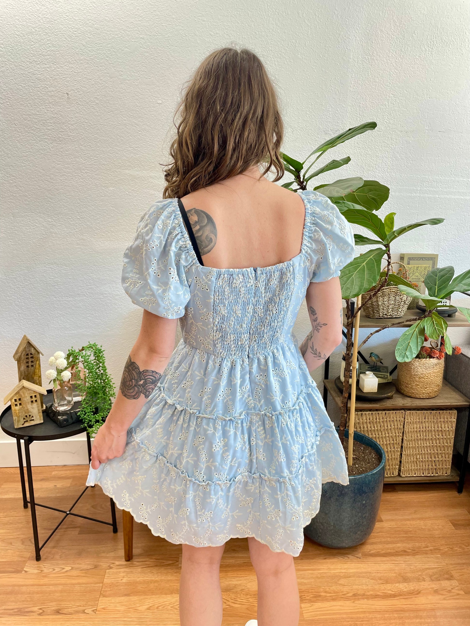 The Eyelet Light Blue Mini Dress is a dreamy, feminine mini that captures the fresh, carefree feeling of a perfect spring day. The soft sky blue fabric is covered in a delicate white eyelet floral embroidery that adds beautiful texture and a sweet, vintage-inspired charm throughout. A gathered scoop neckline with a dainty tie detail, puff sleeves, and a tiered skirt with a scalloped eyelet hem come together in a dress that feels effortlessly romantic from every angle.