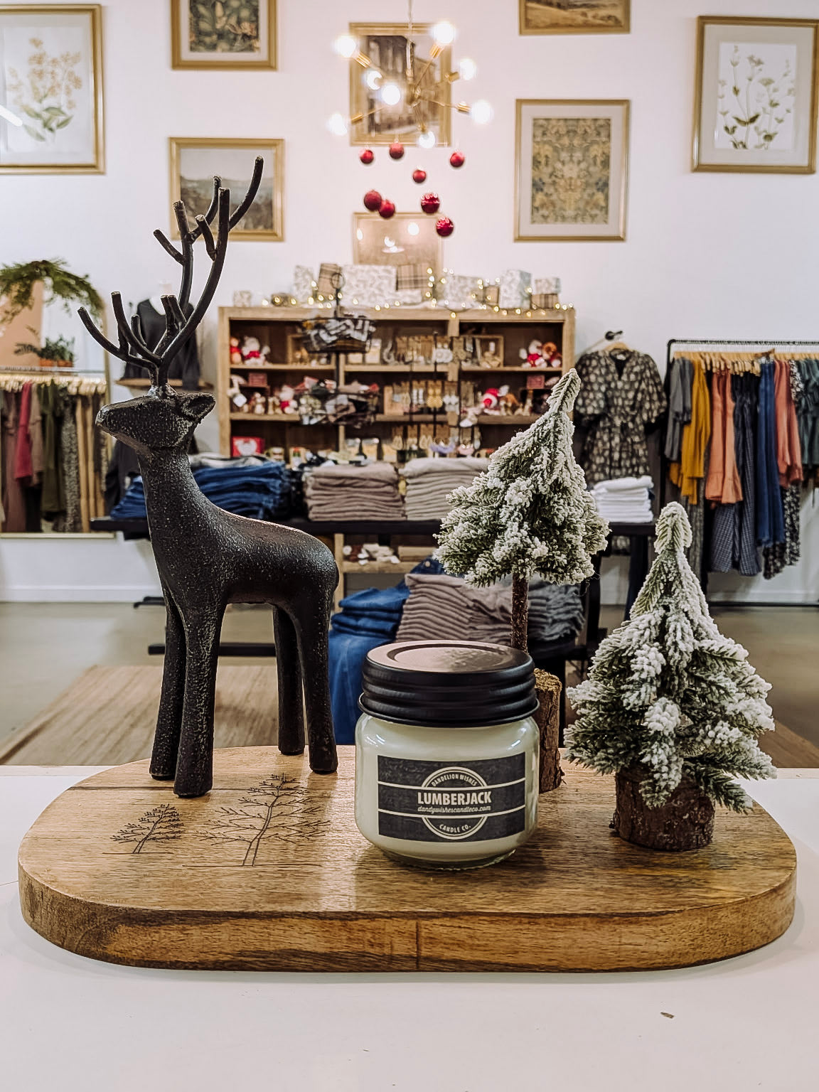 The cast iron standing deer brings dramatic presence - this isn't a delicate figurine, it's a substantial piece with weight and gravitas that commands attention. The frosted trees with wood moss bases create that authentic forest floor feeling with natural textures that look genuinely gathered from the woods. The wood slice trees showcase beautiful natural bark edges and organic wood grain, while the tree-etched serving board provides functional beauty that actually serves your entertaining needs. Your candle adds warm glowing ambiance that makes the whole scene feel more intimate and special.