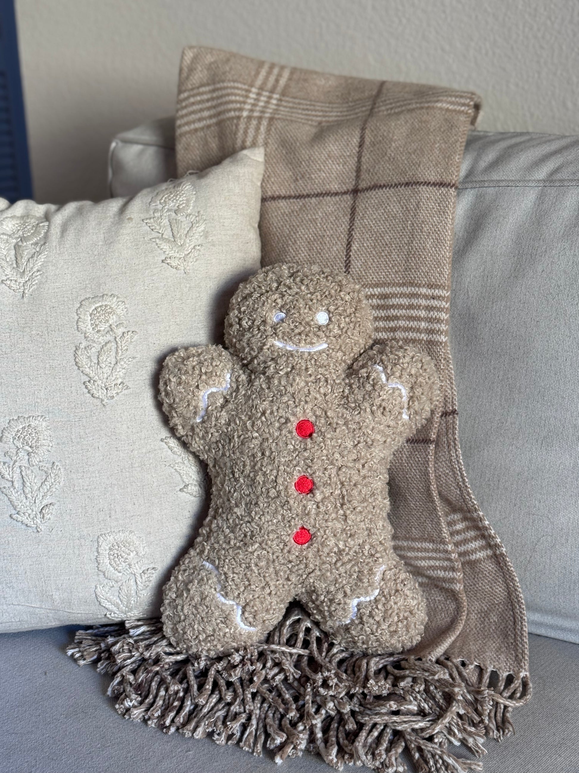 This Gingerbread Man Boucle Pillow in natural oatmeal features charming textured boucle fabric with festive embroidered details including bright red buttons and sweet white icing trim that brings playful holiday spirit and tactile coziness to your seasonal home décor.