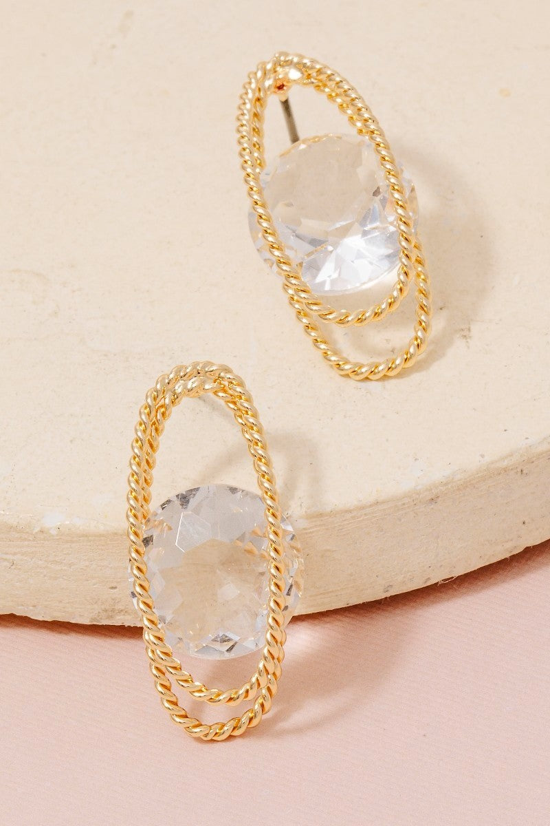 Gold Metallic Oval Rope & Gem Stud Drop Earrings