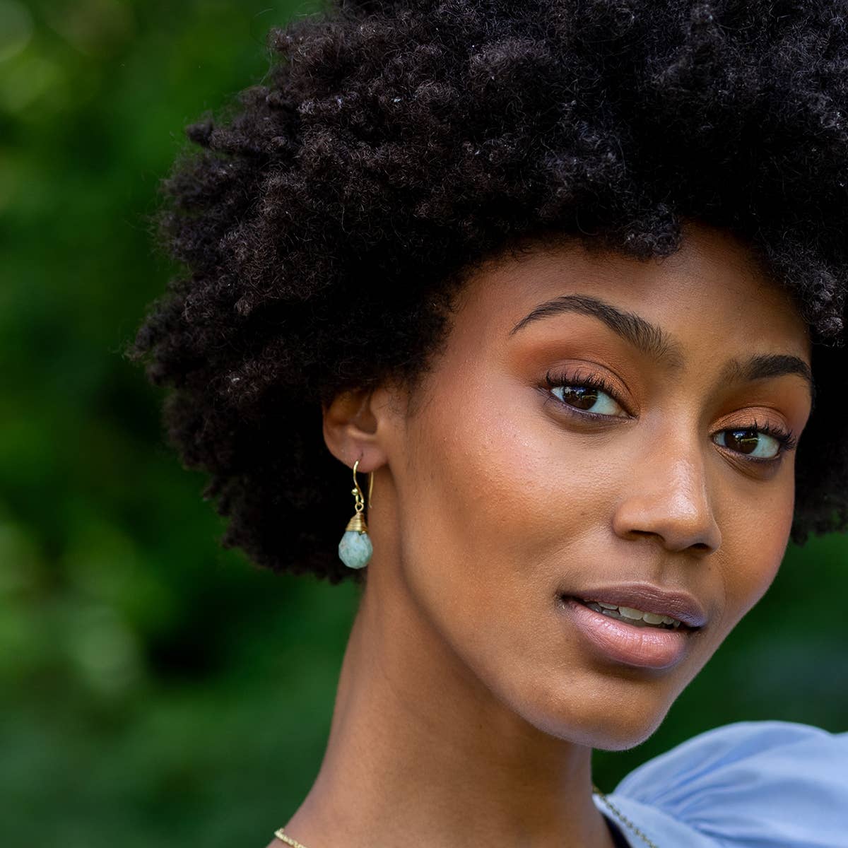 These Amazonite Jasper Teardrop Earrings feature natural aqua-blue amazonite jasper stones with artisan gold wire-wrapping and delicate fish hook closures that bring elevated versatility to any wardrobe. The elegant teardrop design with hand-wrapped gold wire detailing and natural stone variations creates easy bohemian style, while the lightweight construction and simple ear wires add timeless appeal perfect for year-round wear.