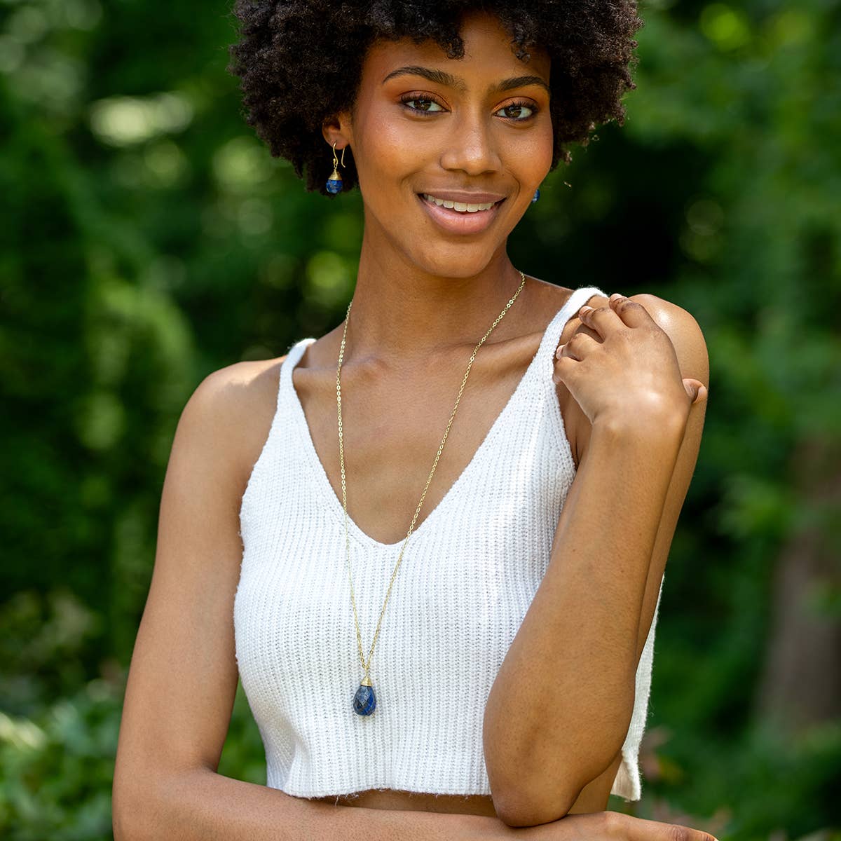 The warm gold tone paired with rich blue lapis lazuli complements any outfit, while the natural stone showcases unique veining and organic beauty and the teardrop shape creates elegant simplicity, making it perfect for those seeking an accessory that combines classic gemstone styling with contemporary minimalist appeal.