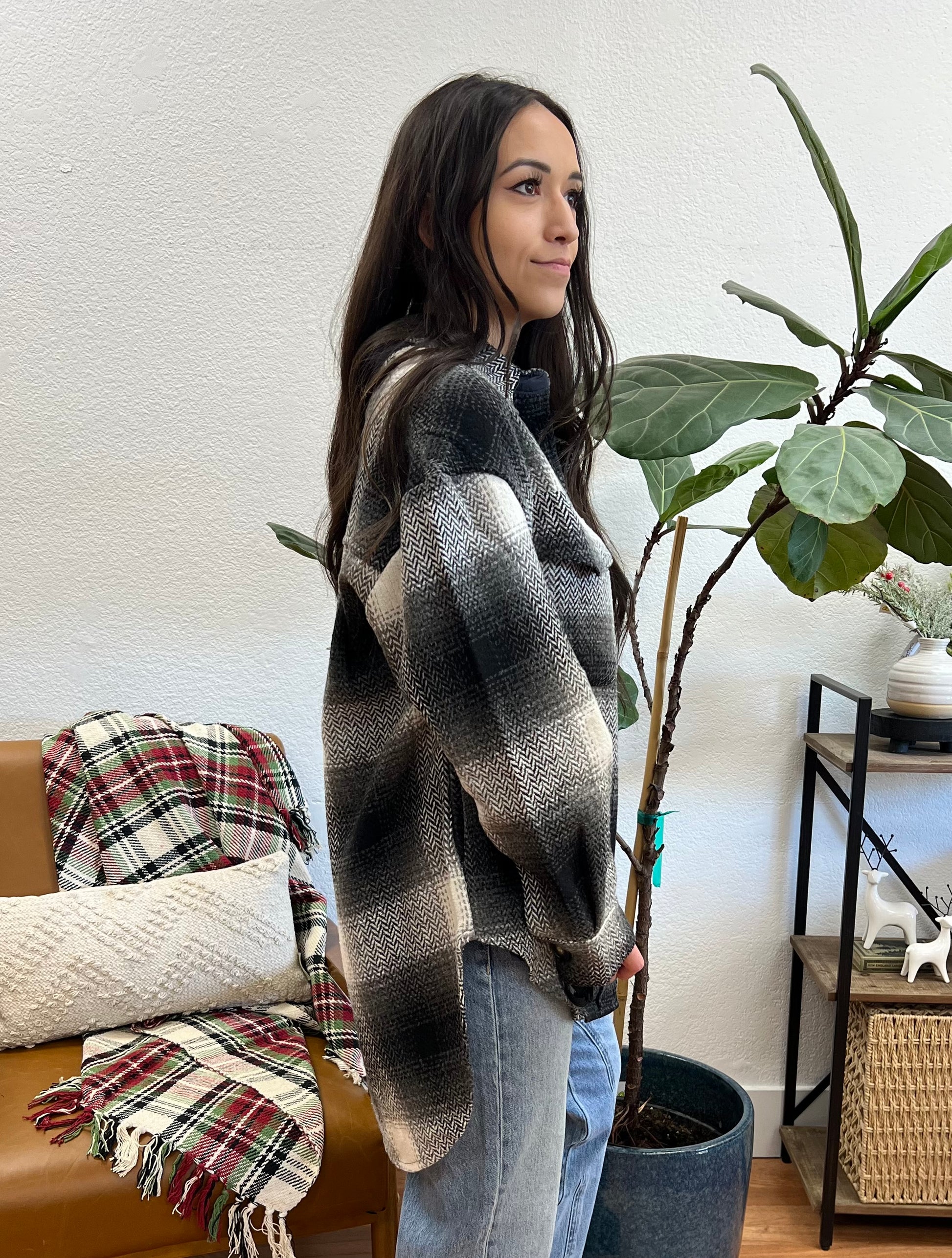The Grey Relaxed Plaid Shacket in charcoal and cream features textured herringbone weave with a bold plaid pattern, complete with button-front closure, dual chest pockets, and relaxed oversized silhouette that delivers cozy shirt-jacket versatility for unpredictable fall and winter weather.