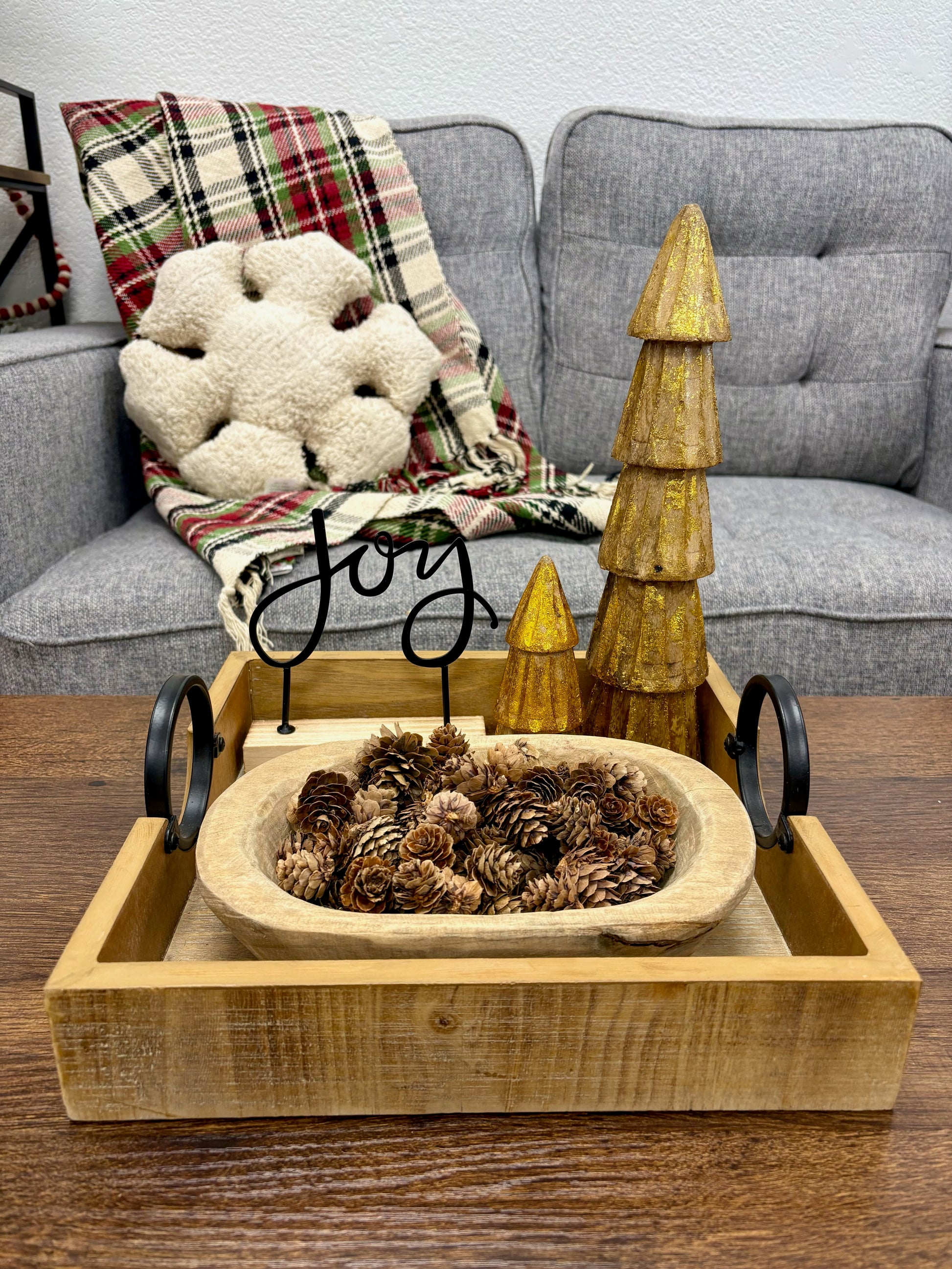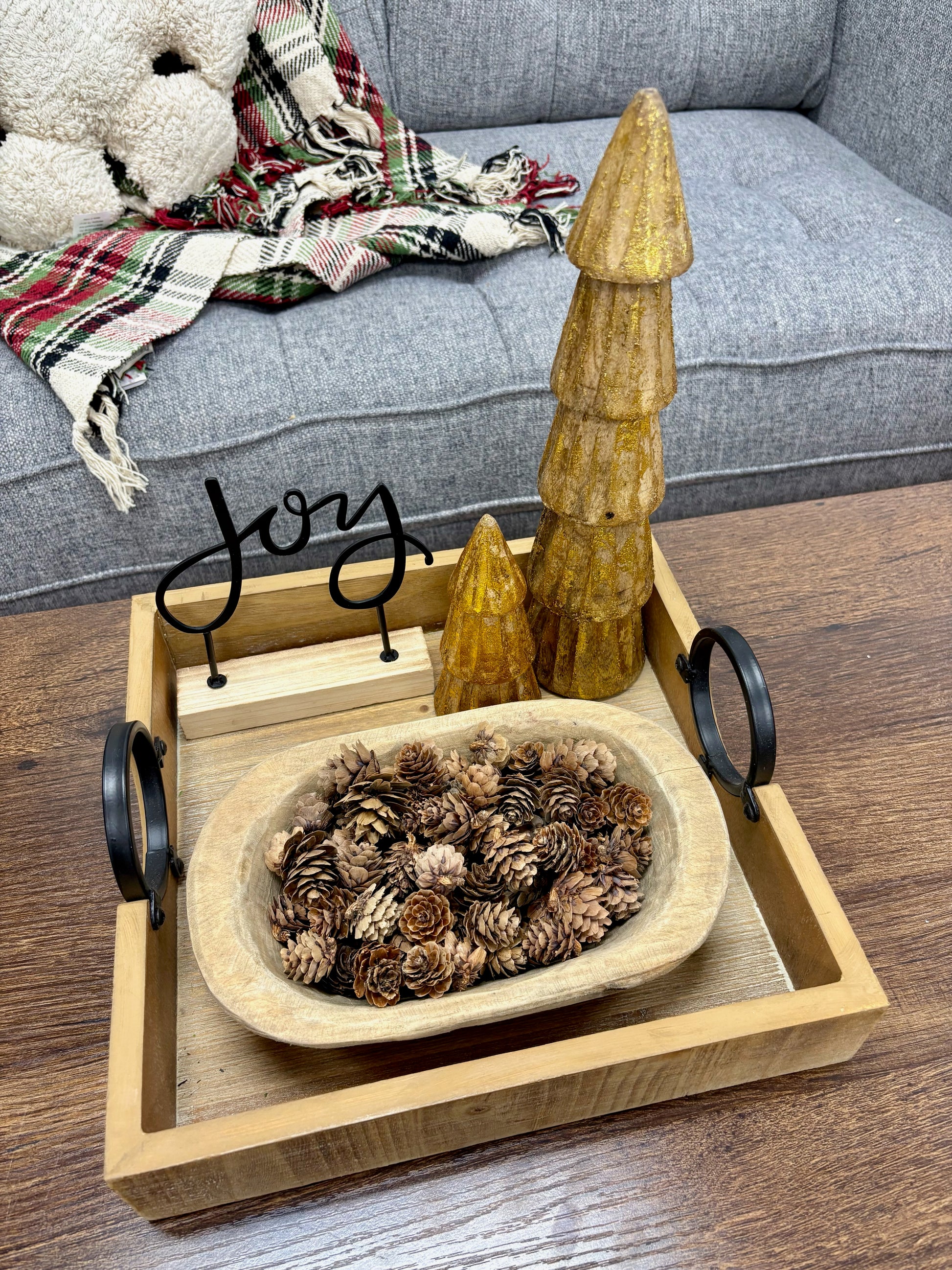 This curated collection features a rustic wood tray with handles, carved dough bowl filled with natural pinecones, two stunning gold mercury glass trees (small and large), and a charming metal "Joy" sign.