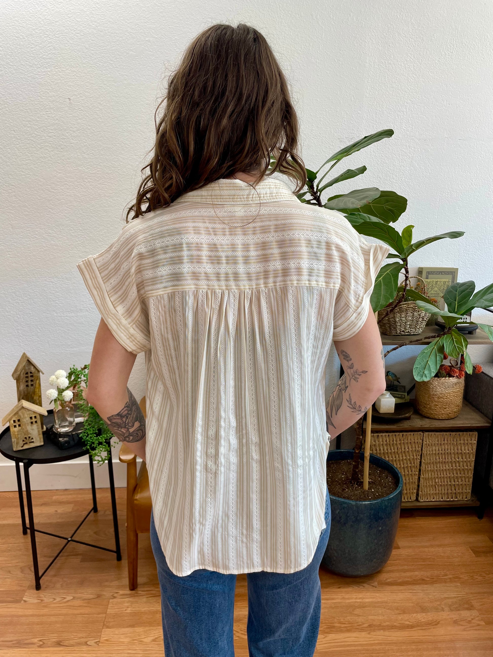 The Khaki Striped Half Button Collared Top is a warm, neutral take on the same relaxed silhouette, this time in a soft cream and khaki stripe that feels effortlessly earthy and understated. Subtle vertical stripes run alongside delicate lace-like textured detailing that gives the fabric a light, layered quality and a touch of feminine charm. The half-button placket with warm wood-toned buttons and a relaxed pointed collar round out a look that is casual, polished, and easy to wear.