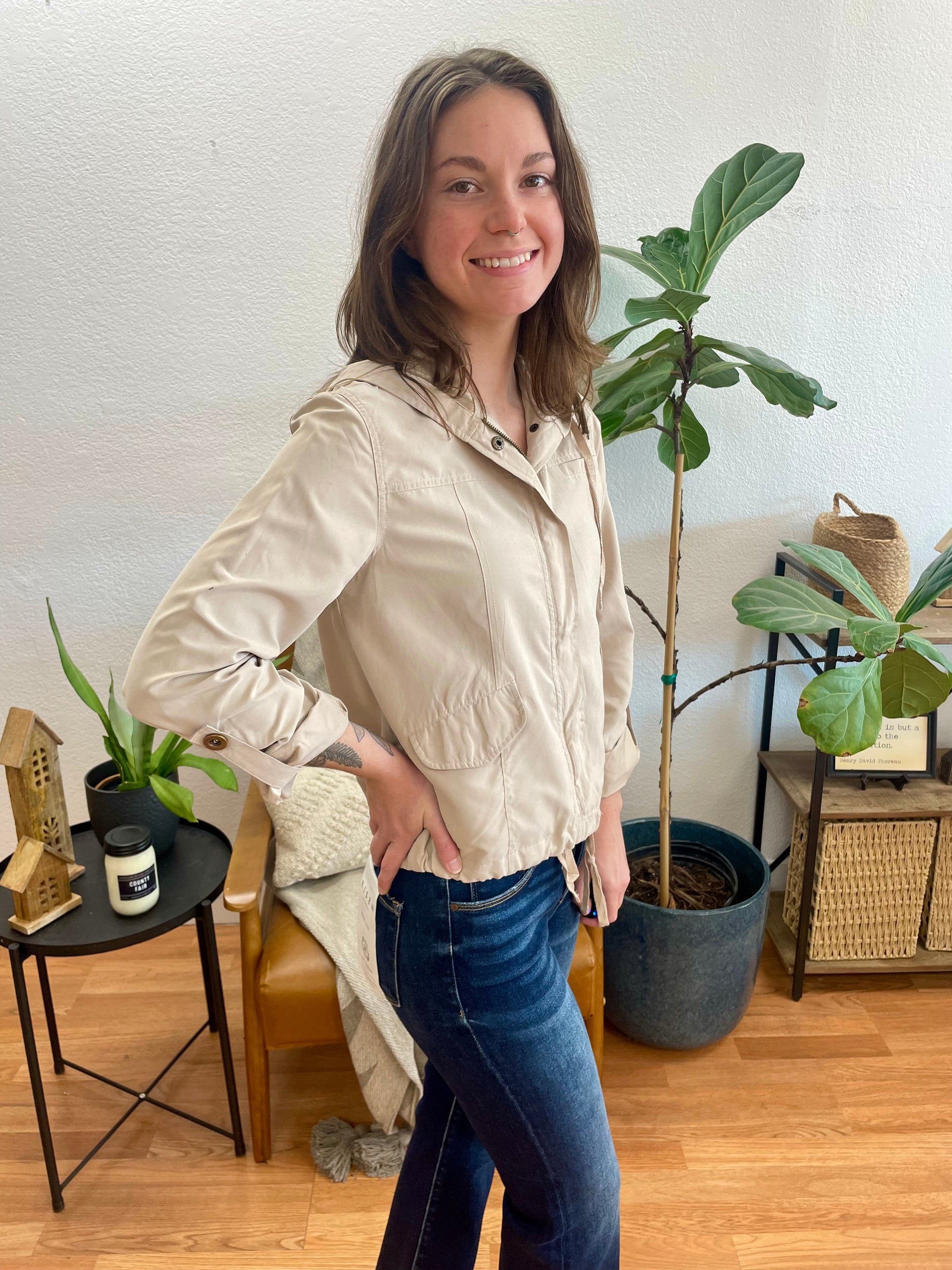 The neutral beige tone coordinates with every casual wardrobe staple, while the chest pockets add practical storage and utility appeal and the hood provides weather protection, making this ideal for those seeking functional outerwear that balances style with everyday practicality.