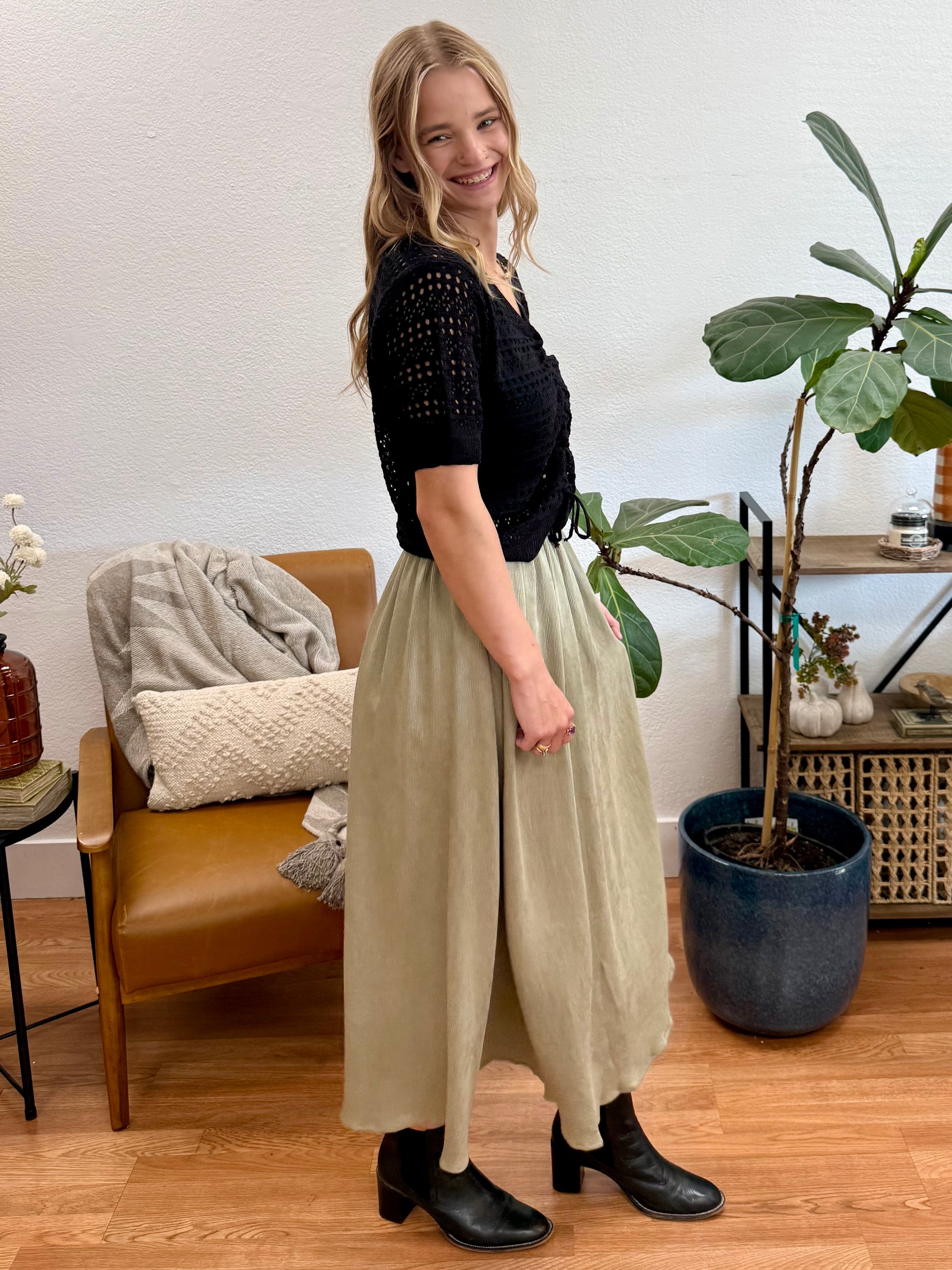 This Light Olive Textured Midi Skirt in soft sage tones features a beautifully textured fabric with a flowing A-line silhouette, elastic waistband, and sweeping midi length that creates an effortlessly romantic look with graceful movement and timeless appeal.