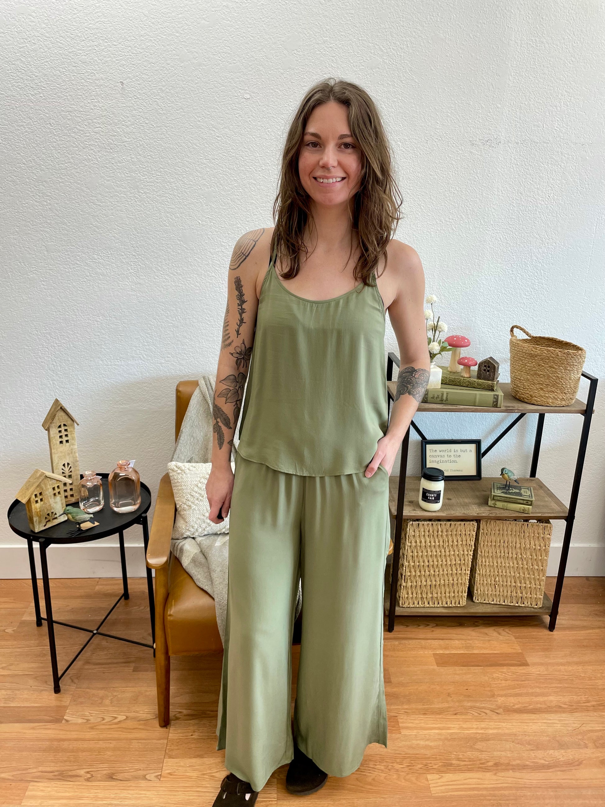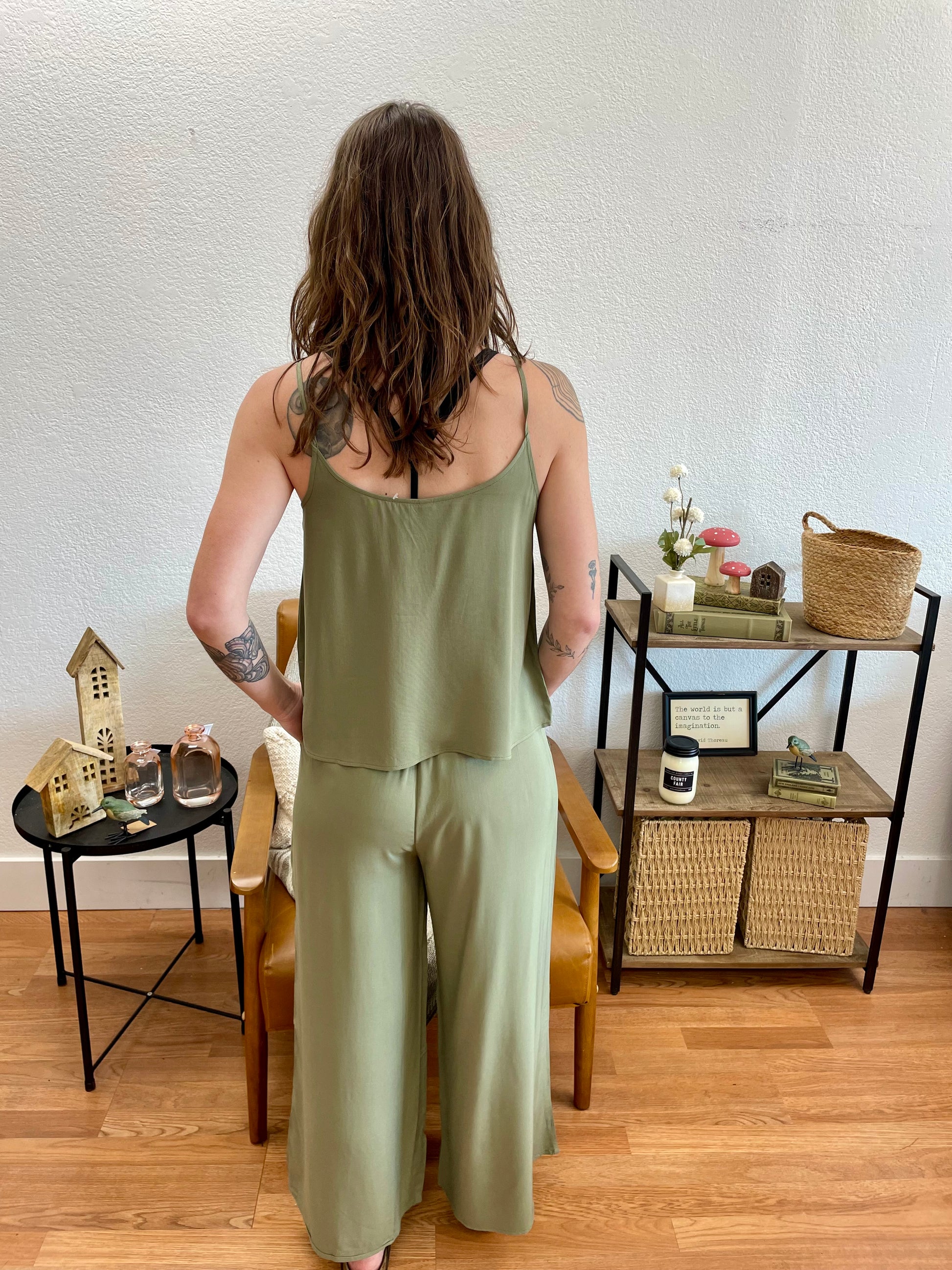 The versatile sage tone serves as a fresh neutral that pairs beautifully with simple tanks, fitted tees, and oversized sweaters. The flowing silhouette flatters every figure while the cropped length hits perfectly at the ankle to showcase your favorite shoes.