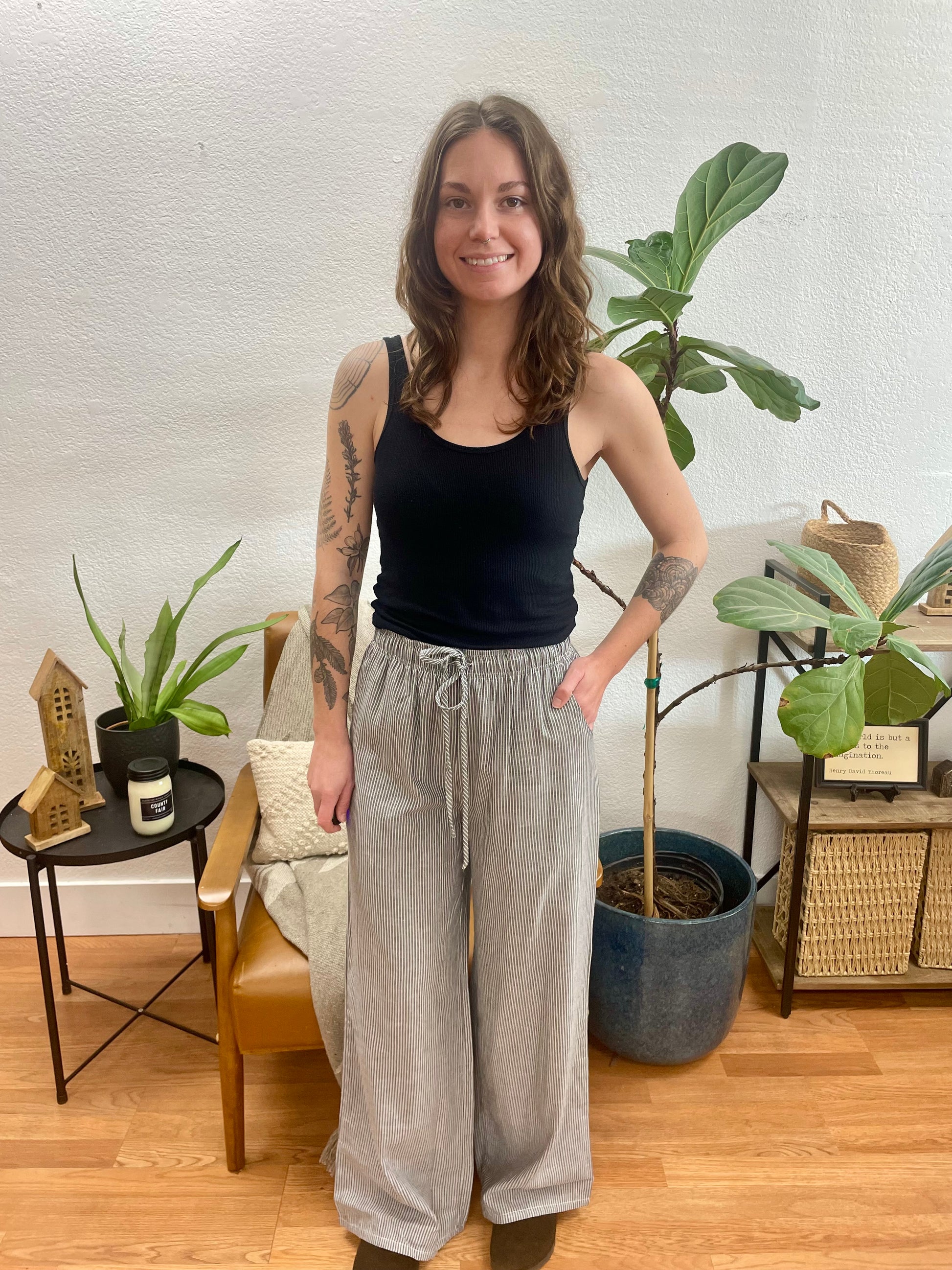 The Lightweight Pull On Striped Pants combines relaxed comfort with elevated style through classic vertical stripes in soft neutral tones and a breezy wide-leg silhouette. The easy pull-on waistband features an adjustable drawstring tie for a customized fit, while the lightweight fabric drapes beautifully for graceful movement and all-day wearability. The timeless stripe pattern adds visual interest without overwhelming, creating a slimming effect that flatters every figure.