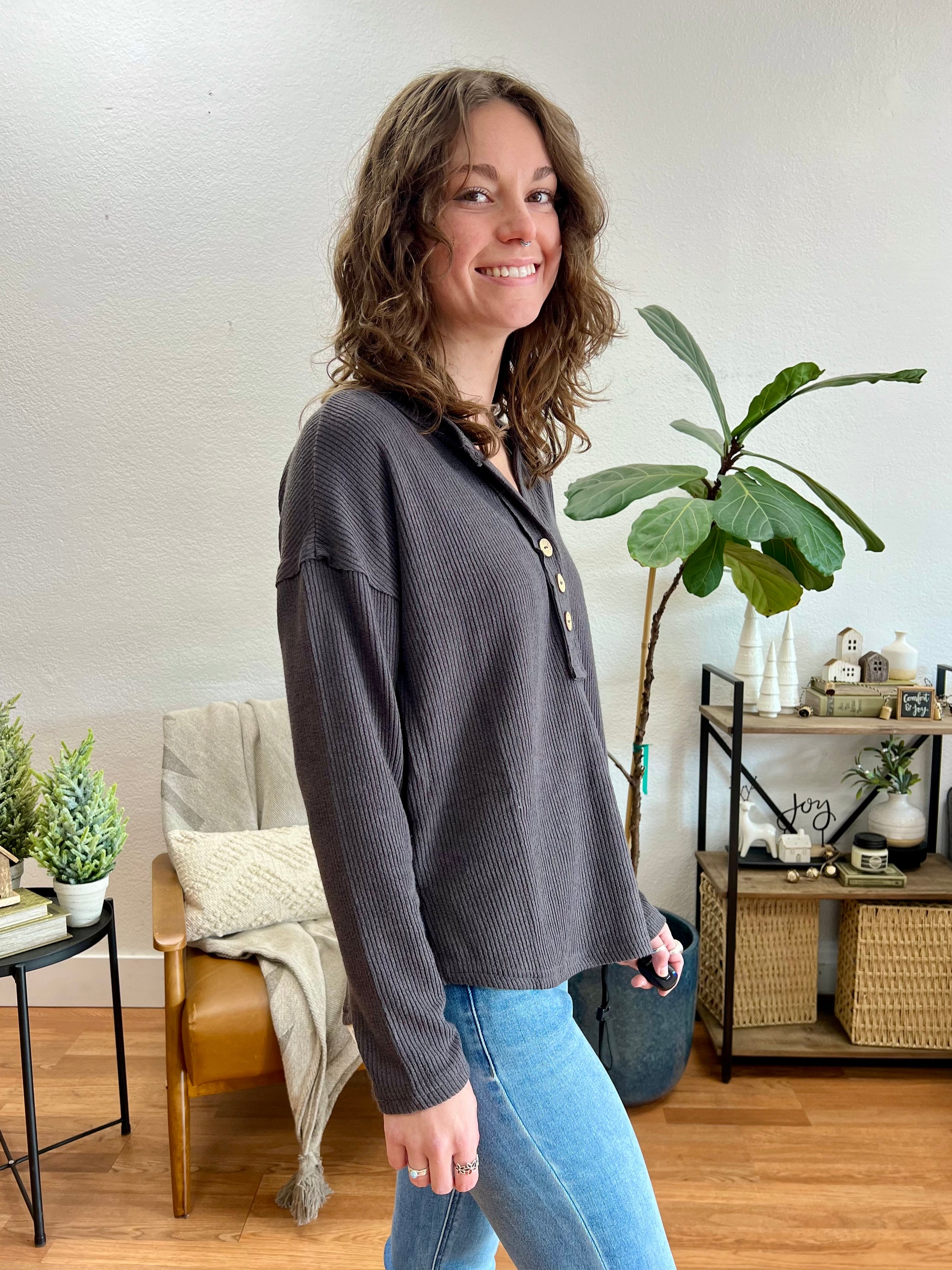 This Navy Half Button V Neck Knit Top features a rich charcoal-navy hue with textured ribbed knit construction and functional half-button placket that brings comfortable versatility to any casual wardrobe. The relaxed oversized fit and soft ribbed fabric with flattering V-neckline create easy everyday style, while the long sleeves and slightly longer hemline add contemporary appeal perfect for year-round layering.