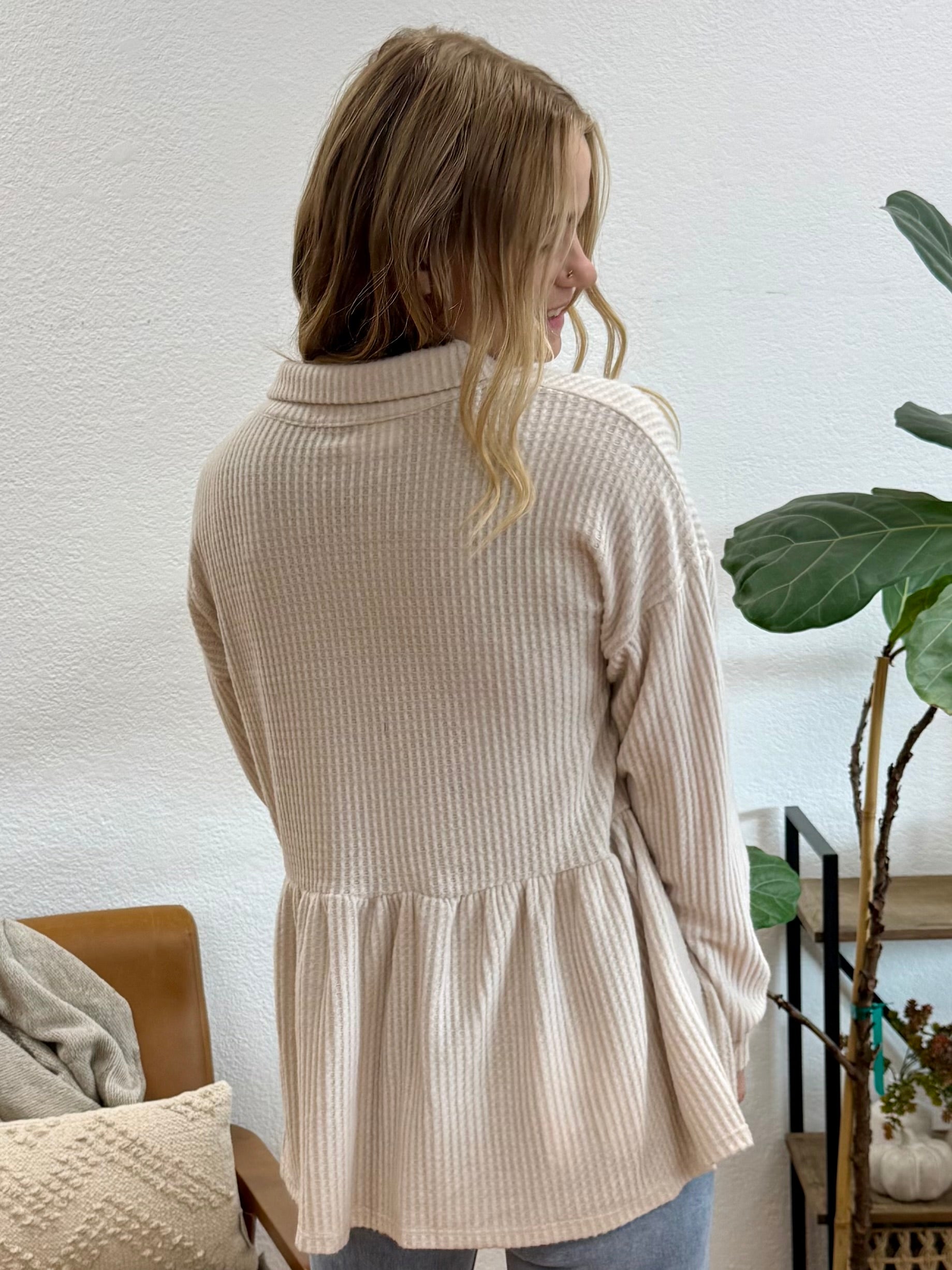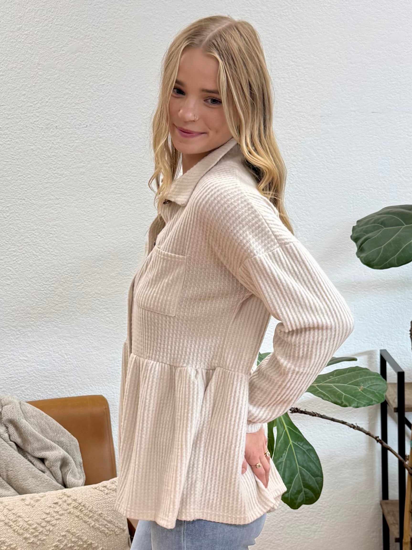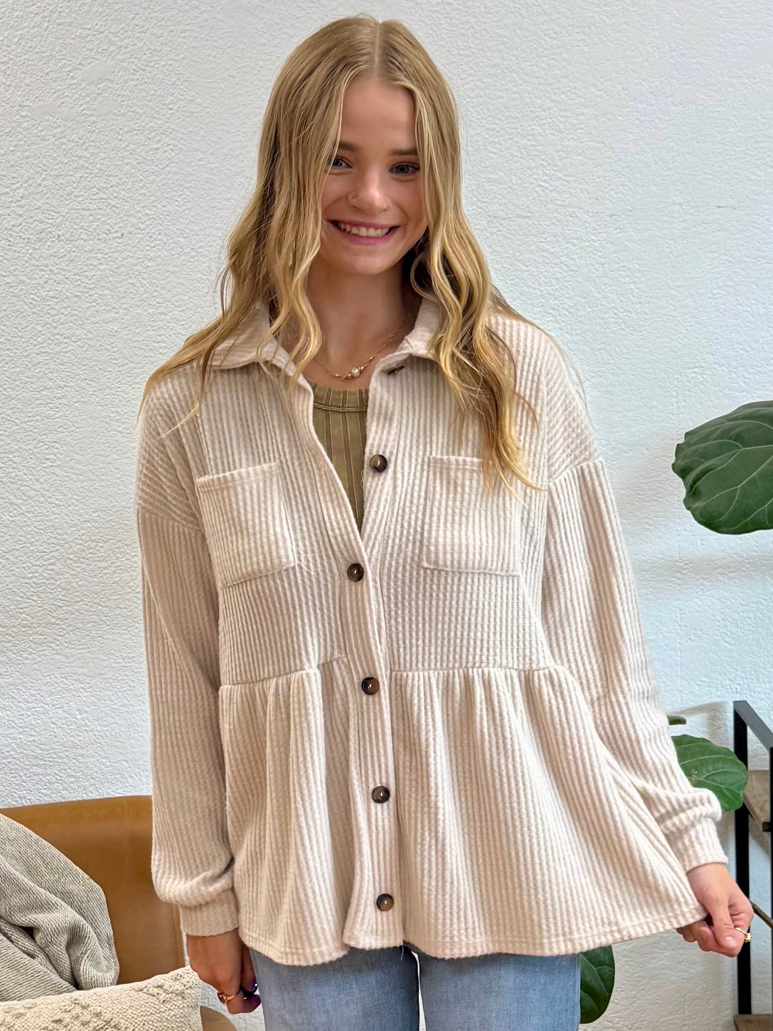 This Oatmeal Solid Waffle Shacket in soft cream features textured waffle-knit fabric with a relaxed oversized fit, functional button-front closure, and dual chest pockets that deliver cozy shirt-jacket versatility for year-round layering.