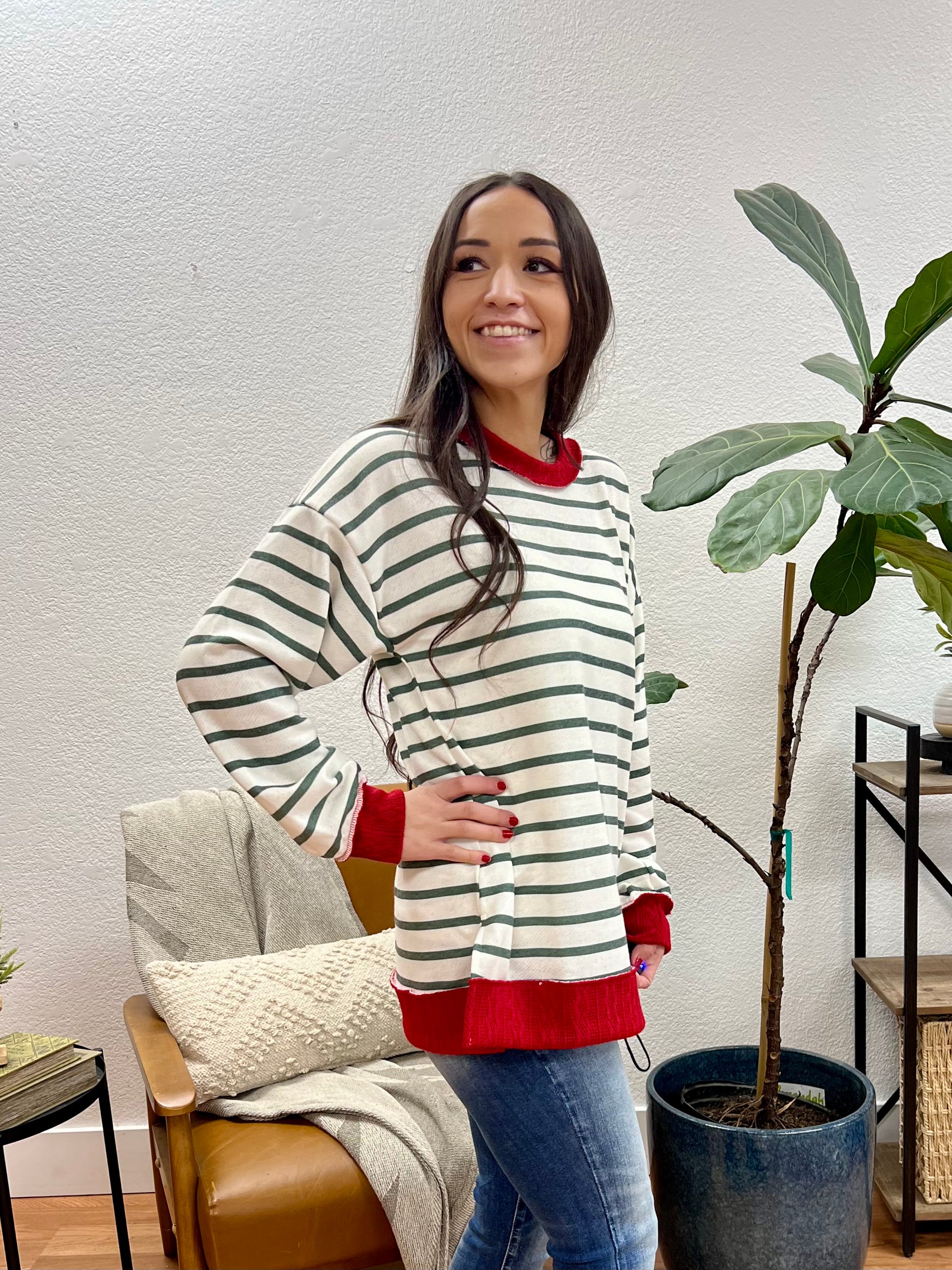 The classic striped pattern with festive red trim serves as a perfect wardrobe staple that pairs beautifully with denim and neutral color palettes, while the soft knit feels cozy and comfortable against skin and the relaxed oversized fit ensures unrestricted movement, making it perfect for those seeking a comfortable essential that combines timeless striped styling with contemporary color-blocked appeal for effortless everyday wear.