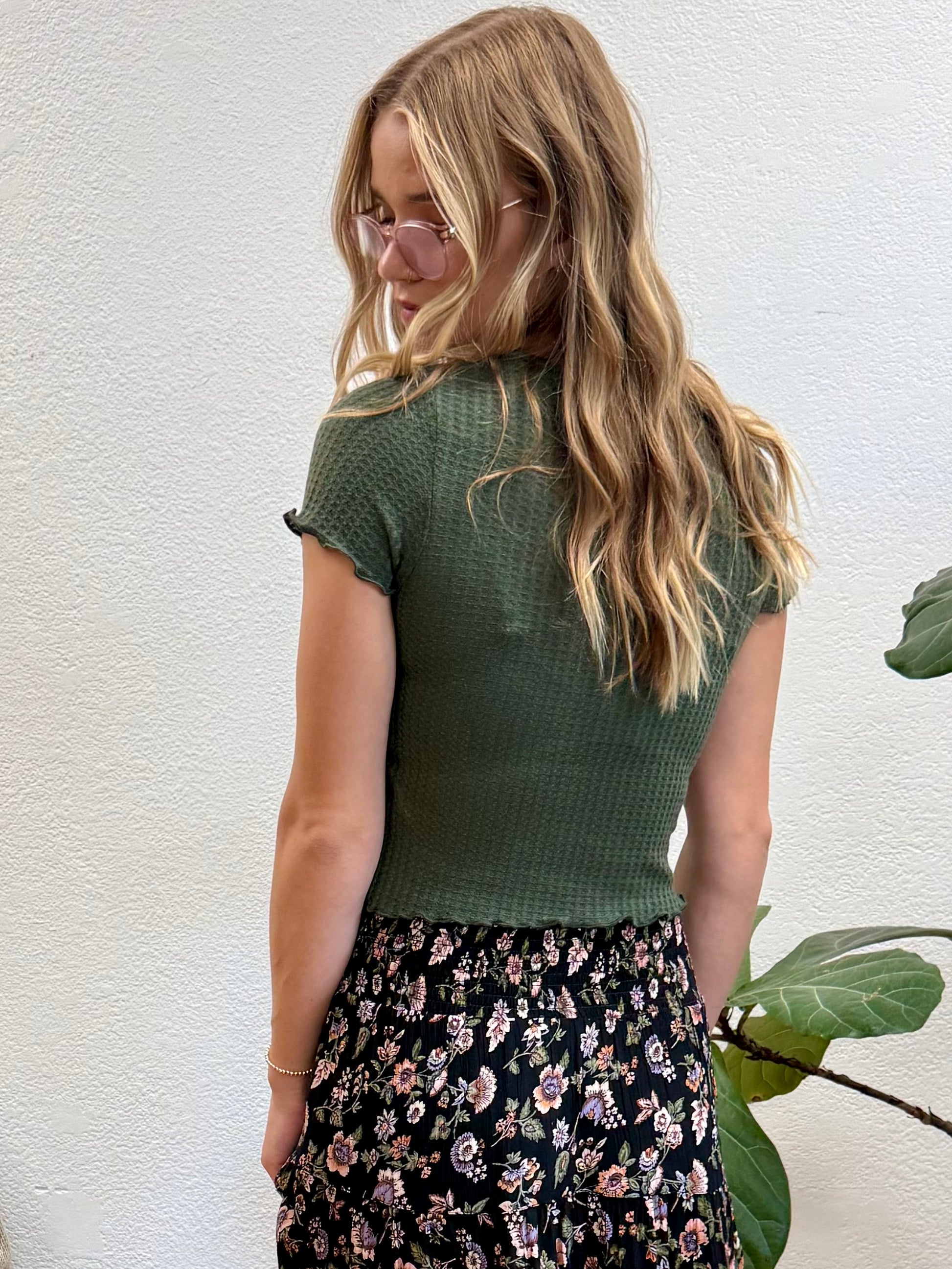The Olive Brushed Waffle Top brings earthy sophistication to your casual wardrobe, featuring a rich olive green hue with soft brushed waffle knit texture and button-front design that creates cozy comfort with natural appeal.