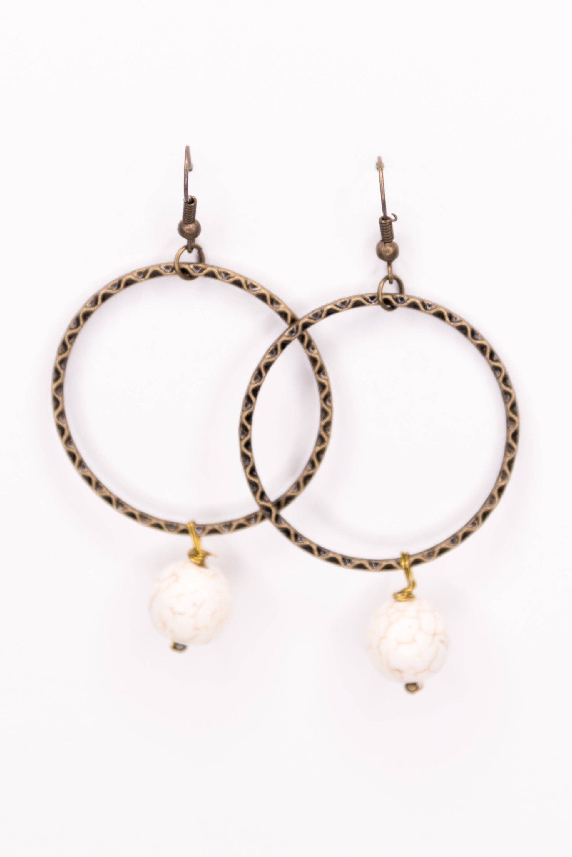 These Olivia Earrings in White combines bohemian simplicity with artisan detail through large circular hoops in antiqued bronze with intricate etched borders. Delicate white marbled beads suspend gracefully from the bottom of each hoop, adding soft contrast against the warm metallic finish. The textured detailing along the hoop edges creates dimensional interest that elevates these beyond basic hoops into statement-making accessories.