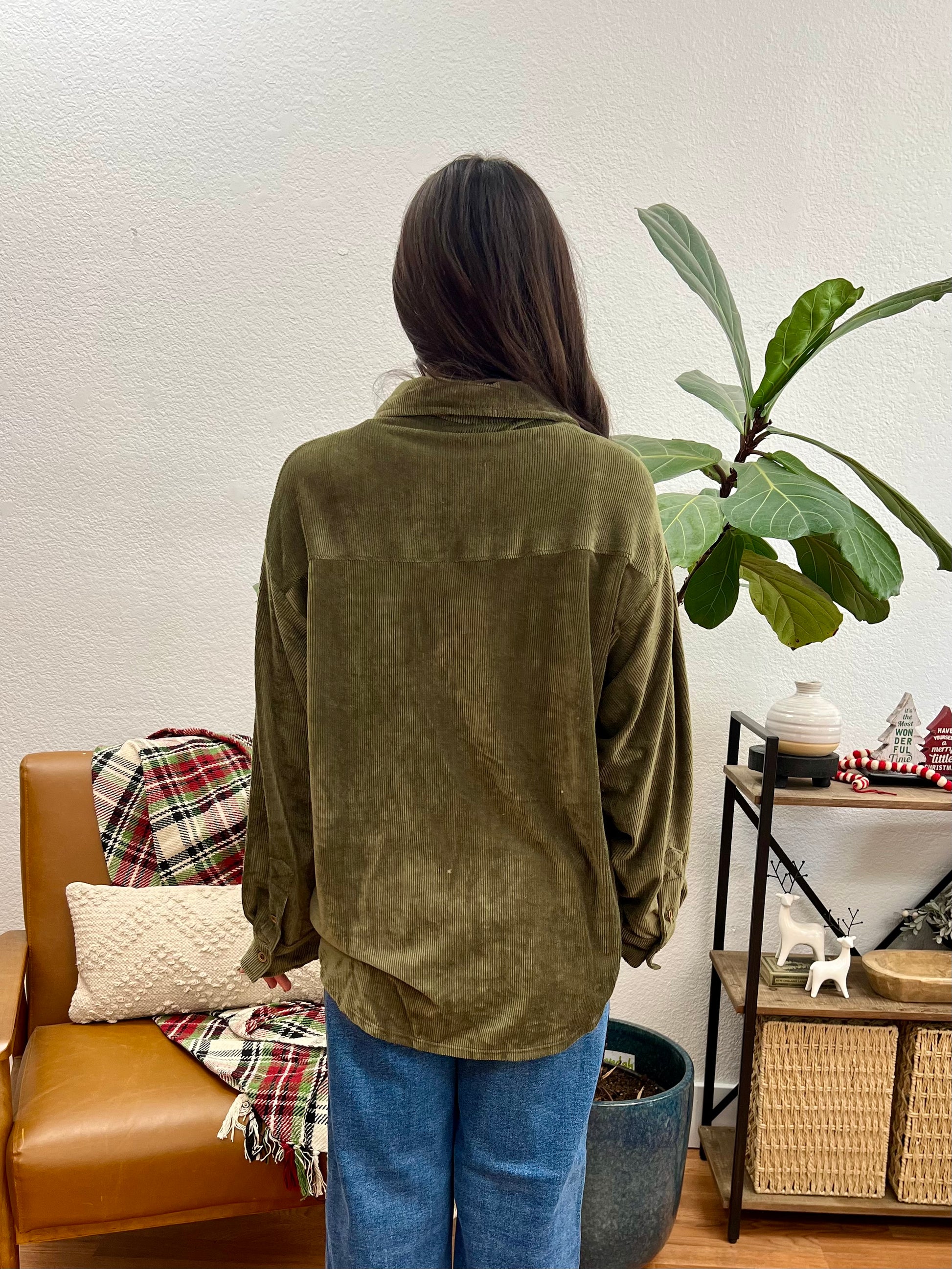 The earthy olive tone brings military-inspired appeal that pairs beautifully with denim and neutral bottoms, while the soft corduroy texture adds tactile dimension and nostalgic charm and the roomy fit allows easy layering over multiple pieces, making it perfect for those seeking a versatile outerwear piece that combines classic corduroy styling with contemporary oversized fit for effortless everyday wear.