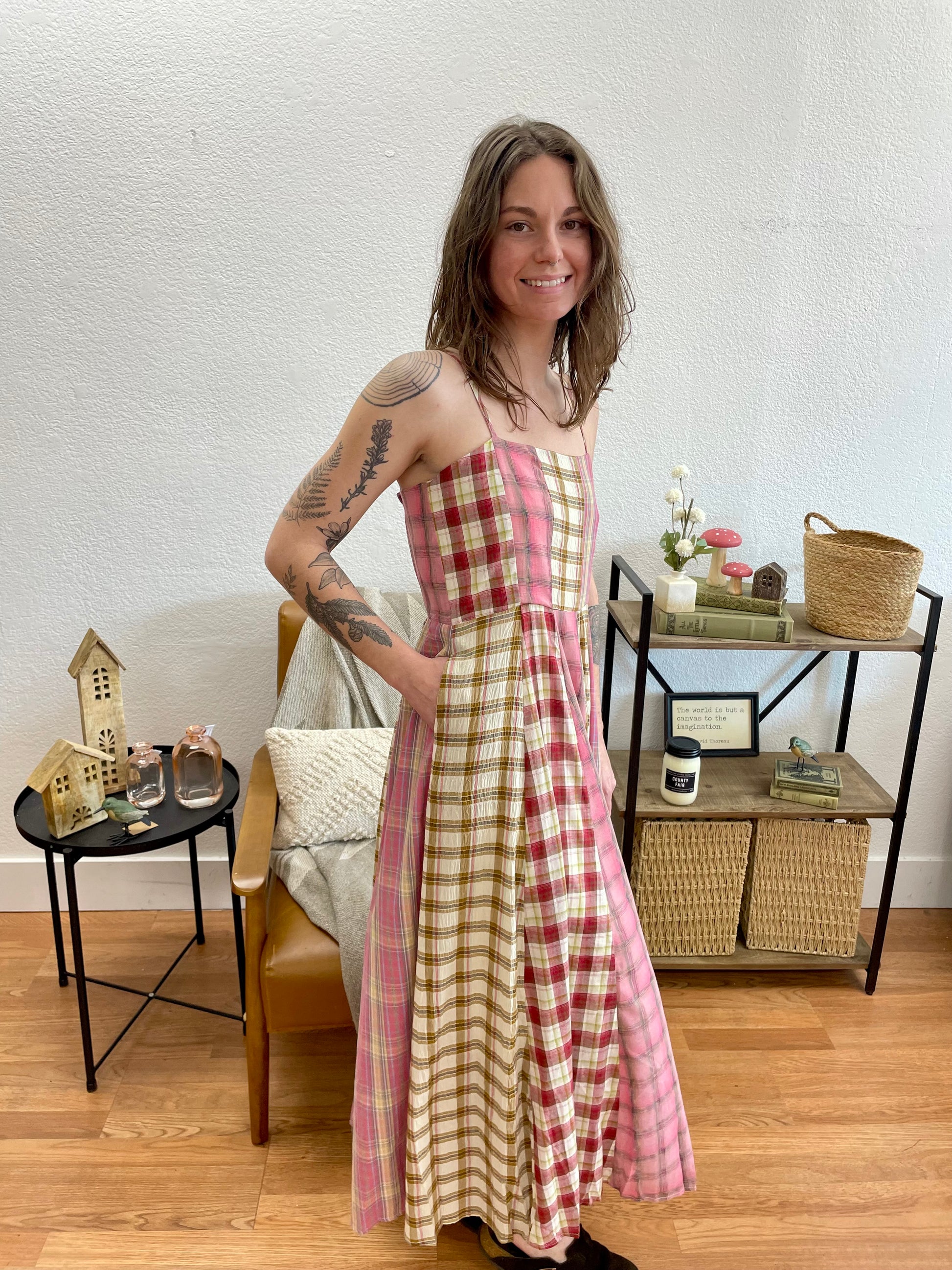 This Pink Mixed Checkered Midi Dress brings playful bohemian charm with its unique patchwork design featuring an artful mix of pink, coral, olive, and cream plaid patterns. The fitted bodice with adjustable spaghetti straps flows into a gently gathered midi skirt that creates beautiful movement. The varied plaid patterns arranged in vertical panels add visual interest and create a one-of-a-kind look, while the lightweight fabric drapes beautifully for comfortable all-day wear.