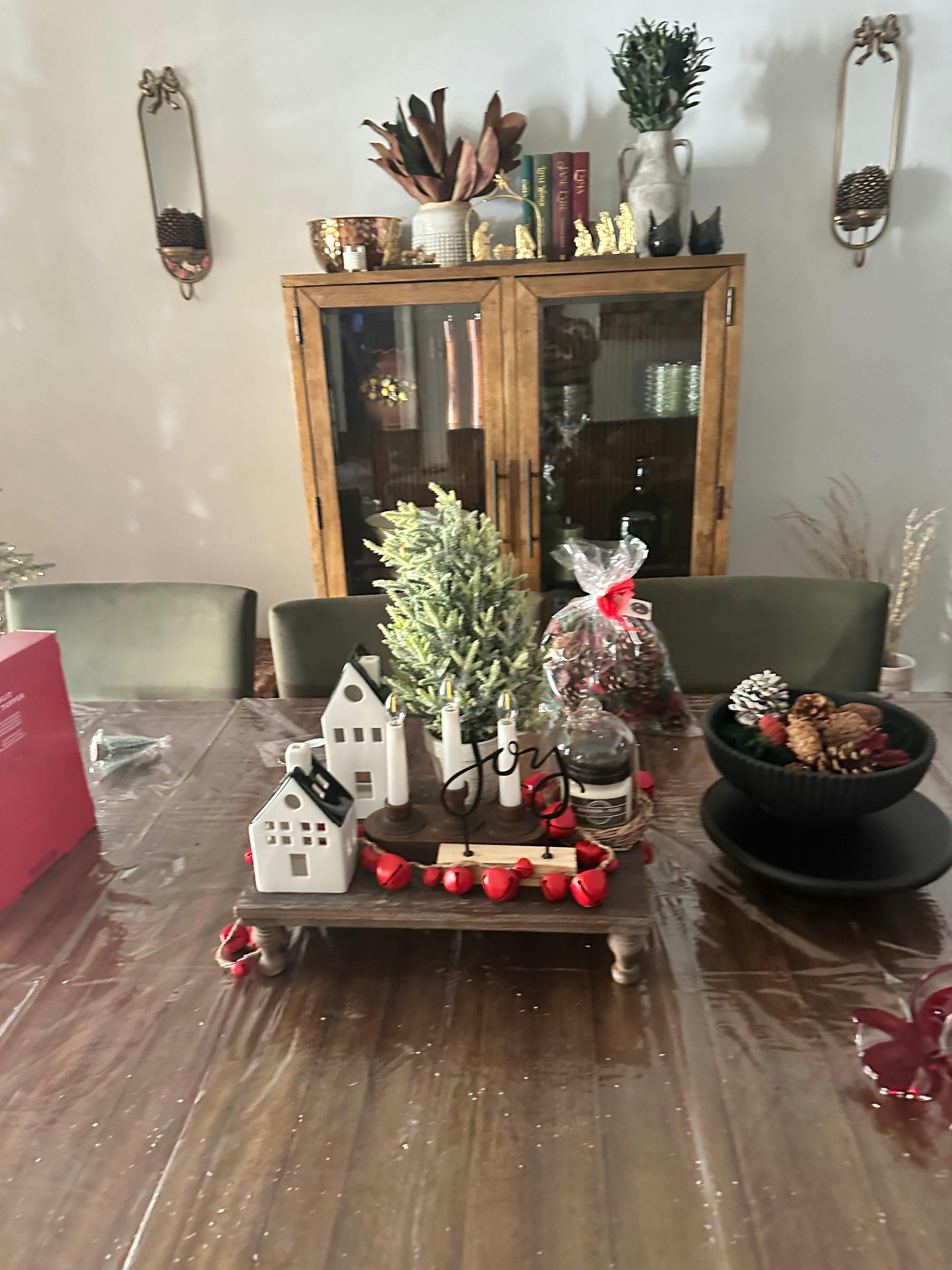Cute, but it’s squished. I can’t fluff it out . I thought the set idea so great, but it was overpriced. I added a flameless candle for some light. Still working on how the final product will look.