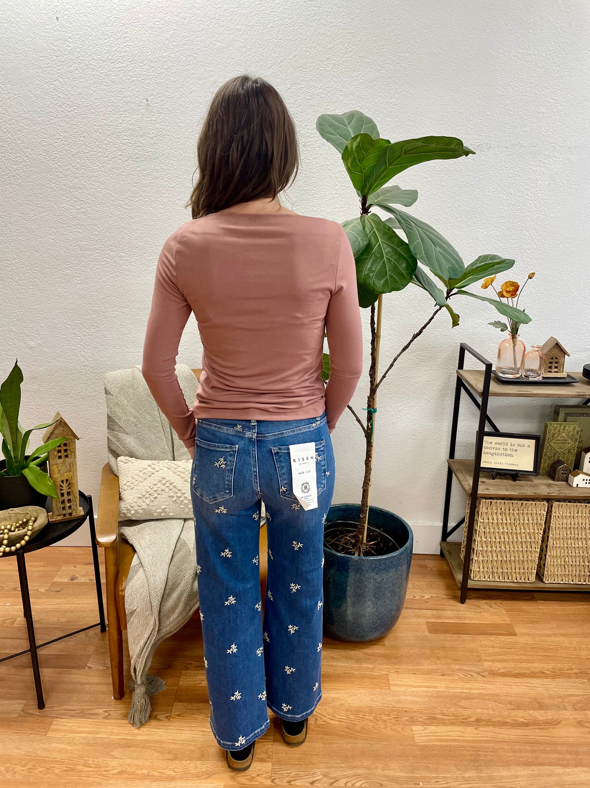 The Risen Embroidered Tummy Control Wide Leg Crop Jeans features medium wash denim with delicate scattered floral embroidery throughout in wide leg cropped silhouette with supportive high-rise waist and structured five-pocket styling with button fly closure that brings feminine detail to modern casual wardrobes. The premium denim construction with tummy control panel creates flattering comfortable style, while the soft embroidered accents and cropped wide leg cut add playful visual interest and all-day wearability perfect for year-round styling.