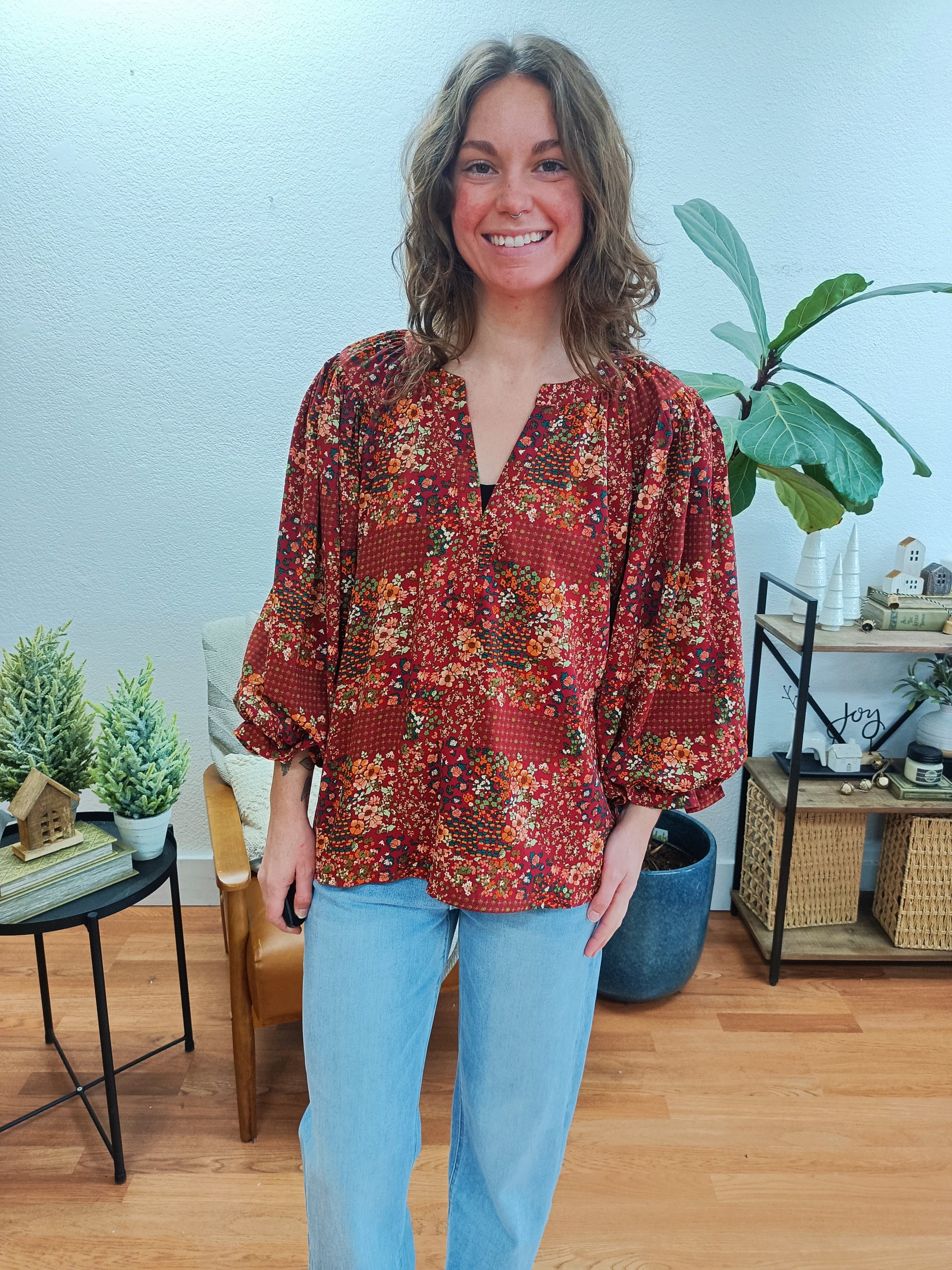 The warm rust and floral palette provides rich color versatility, while the mixed patchwork print showcases vintage-inspired character and visual interest and the balloon sleeves add dramatic feminine detail, making it perfect for those seeking a statement piece that combines bohemian floral styling with contemporary silhouette and effortless everyday elegance.
