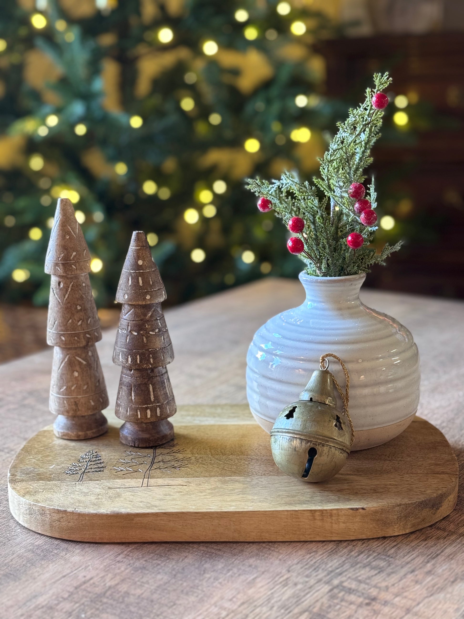 The tree-etched serving board isn't just decorative - it's actually functional for serving appetizers, charcuterie, or desserts while looking like intentional holiday decor. The hand-carved trees add rustic charm that complements the board perfectly, while the two-toned vase with frosted pine creates a fresh centerpiece. The metal bell ornament adds that gentle jingle reminder that this season is about gathering and celebrating together.