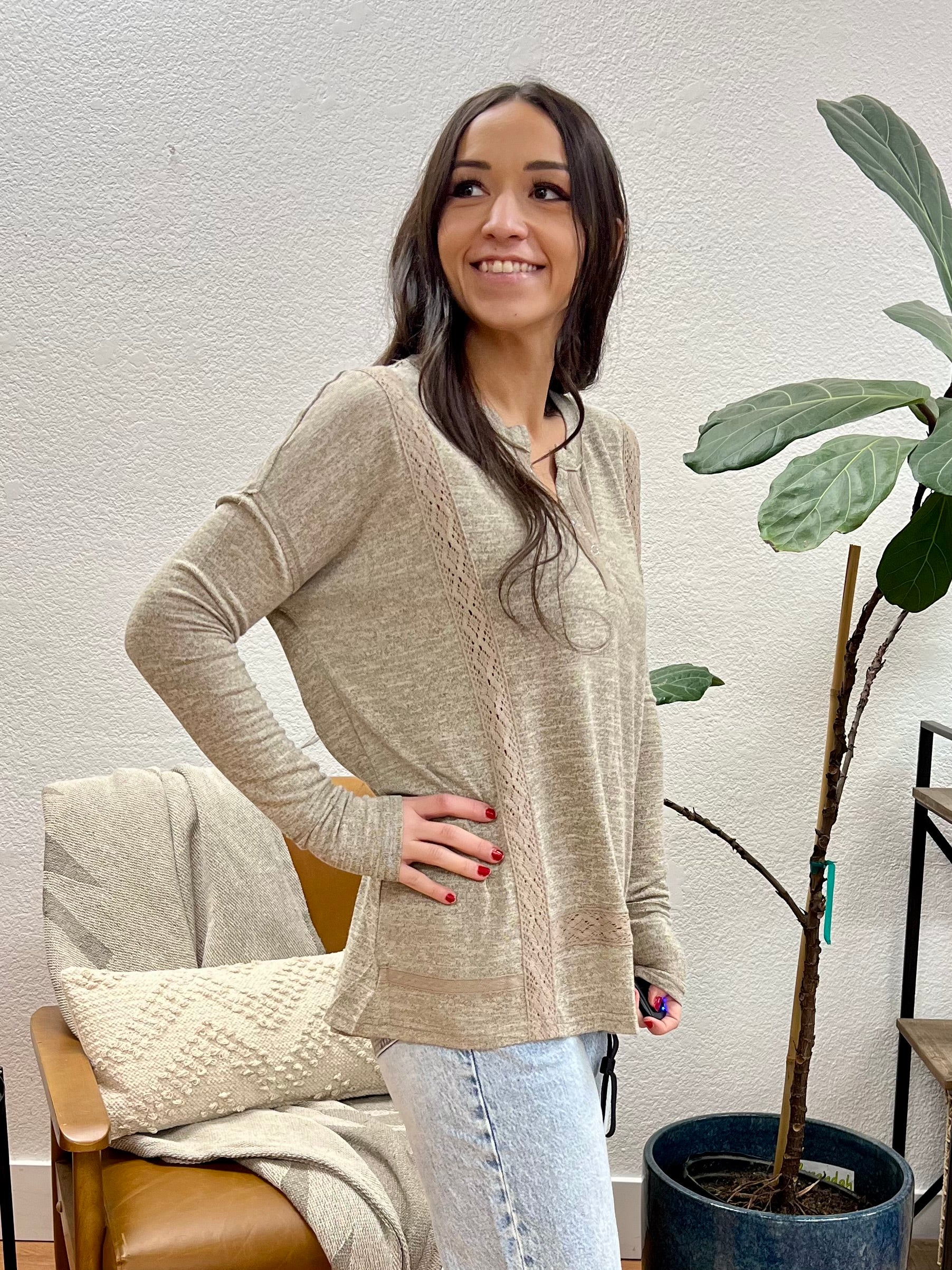This Taupe Brushed Lace + Knit Henley Top features a soft heathered taupe hue with ultra-soft brushed knit construction, romantic lace panel detailing, and functional henley button placket that brings comfortable versatility to any casual wardrobe. The relaxed oversized fit and plush brushed fabric with feminine lace accents create easy everyday style, while the long sleeves and slightly longer hemline add contemporary appeal perfect for year-round layering.