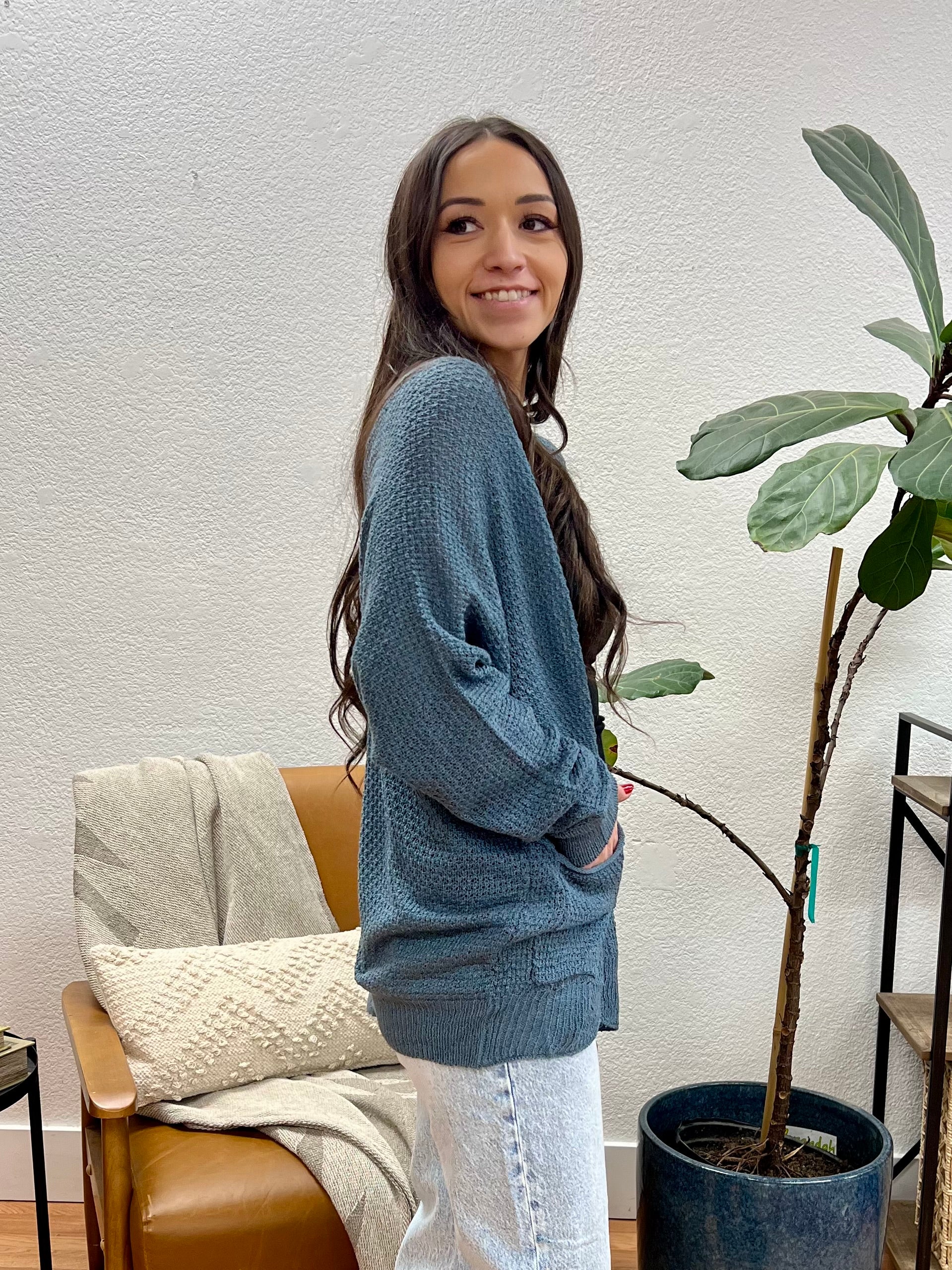This Teal Crochet Cardigan features a rich dusty teal-blue hue with textured waffle knit construction and open-front design that brings comfortable versatility to any wardrobe. The relaxed oversized fit and cozy crochet-style fabric with functional front pockets create easy everyday style, while the drop shoulder sleeves and ribbed cuffs add contemporary appeal perfect for year-round layering.