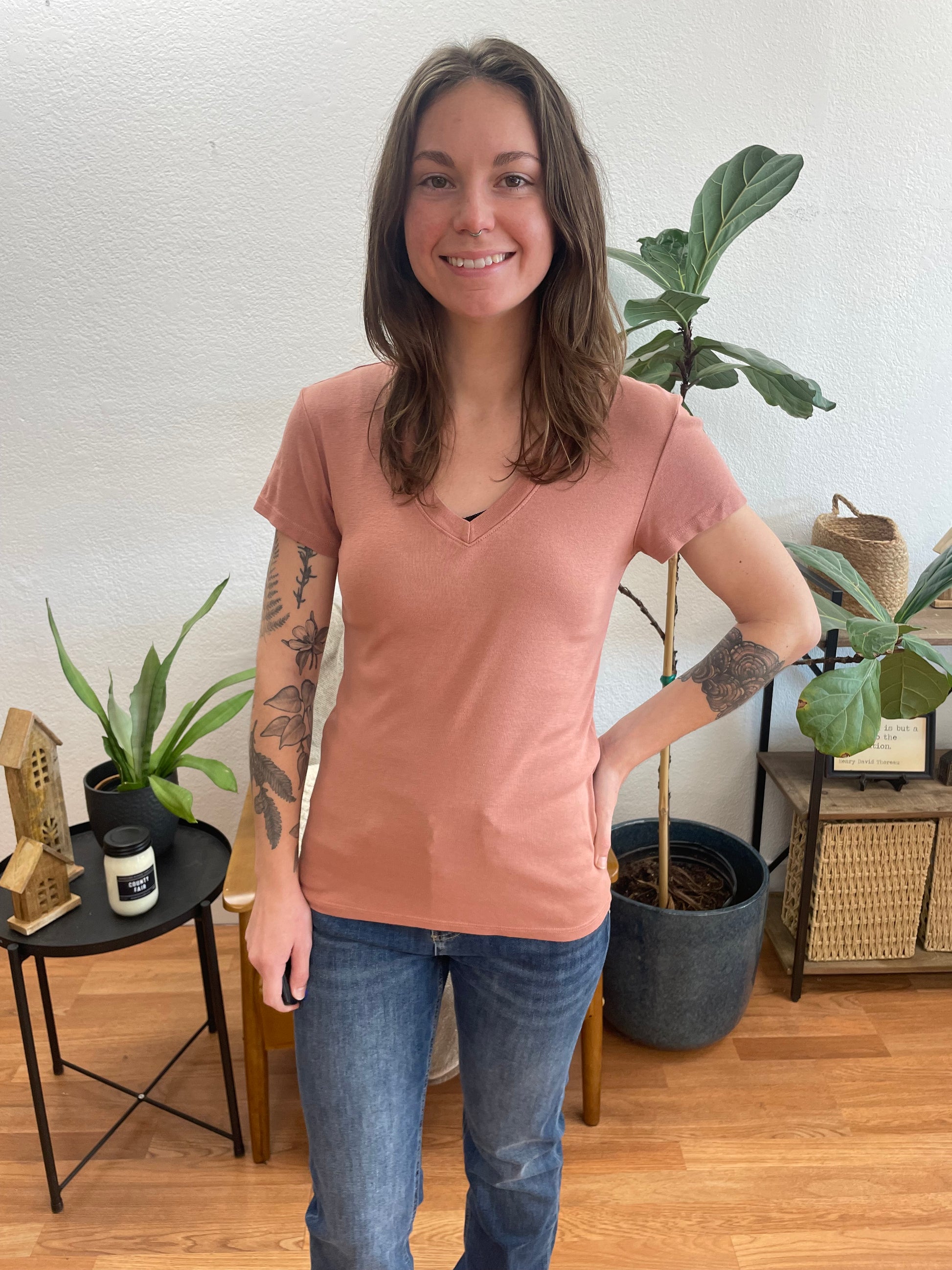This Terra Cotta Classic Slim V Neck Tee elevates your everyday essentials with versatile warmth and sophistication that brings effortless style to any casual ensemble. Crafted in a flattering slim fit silhouette, this short-sleeve staple features a classic v-neckline that elongates the neck and offers endless styling potential. The rich terra cotta hue is a perfect blend of peachy pink and earthy warmth that adds a sun-kissed glow to your complexion while remaining neutral enough to pair seamlessly with denim, shorts, or your favorite skirts.