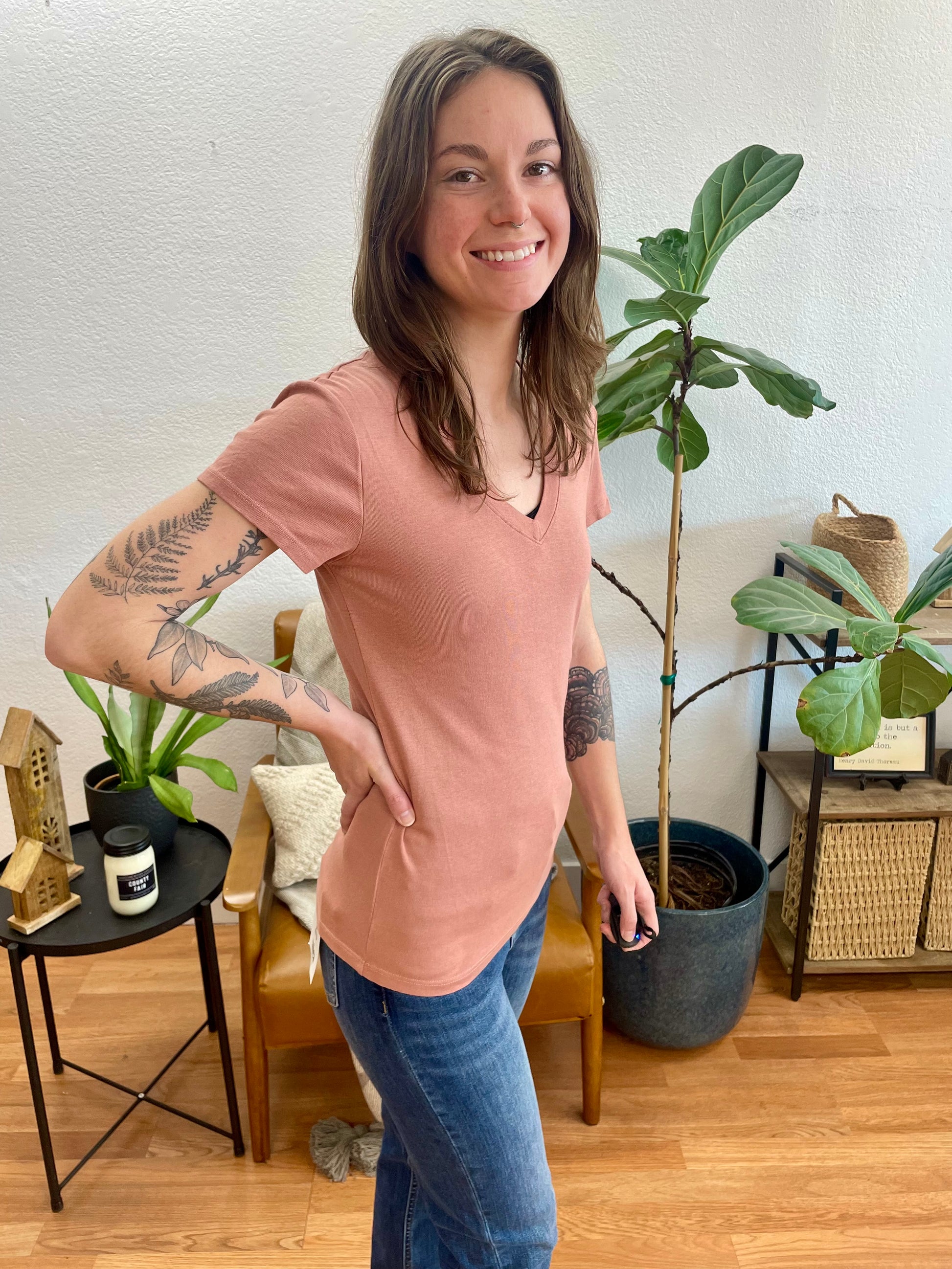 Perfect for building a capsule wardrobe, this terra cotta tee coordinates beautifully with blues, whites, greens, and neutrals, making it an indispensable piece that multiplies your outfit options while keeping your morning routine simple and stress-free.