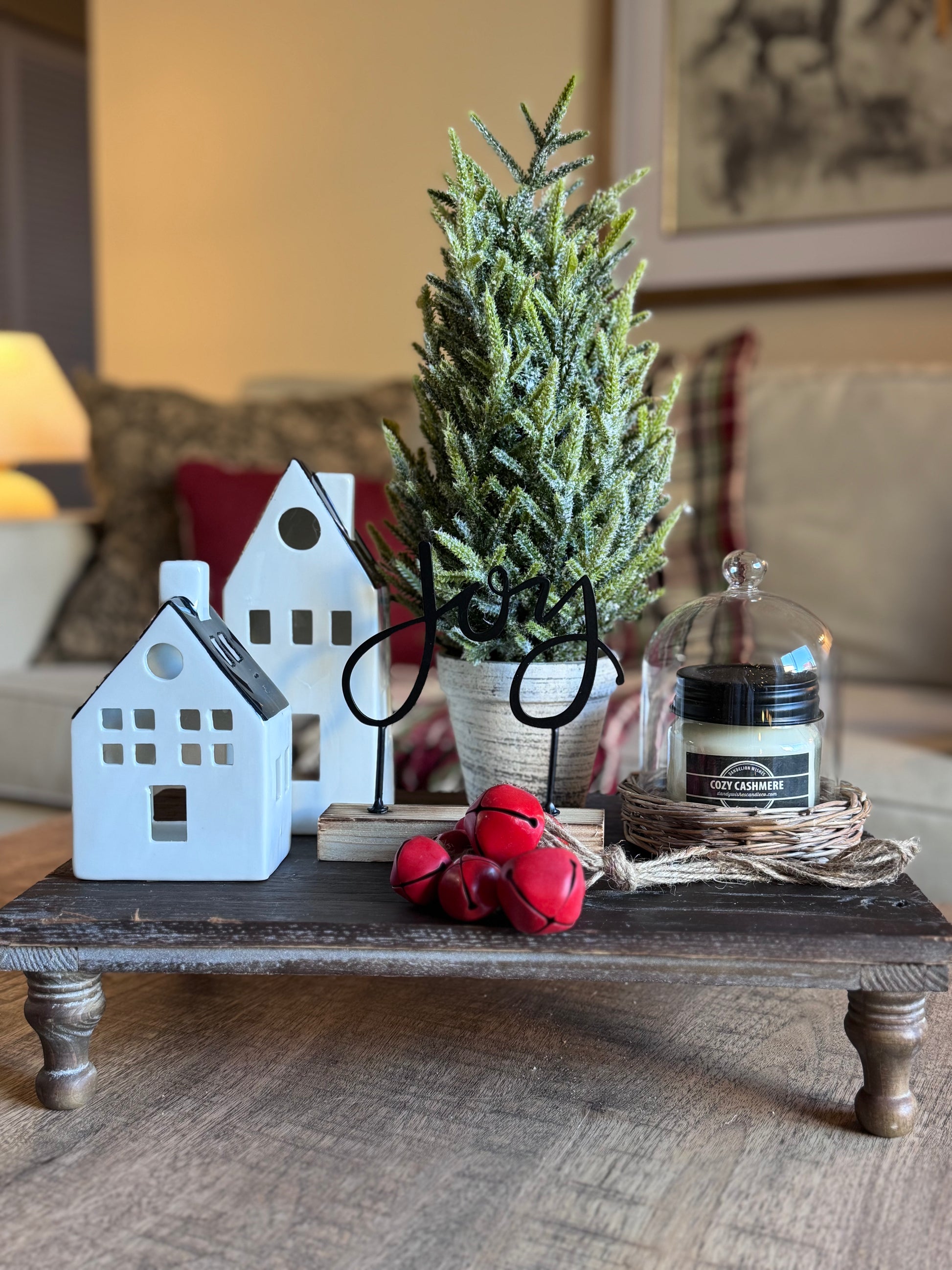 Use the riser to elevate your village, cluster the houses like a town square, let the frosted tree anchor the scene, place your candle under the cloche for warm glow, and display the jingle bell cluster for festive sound and that perfect pop of red.