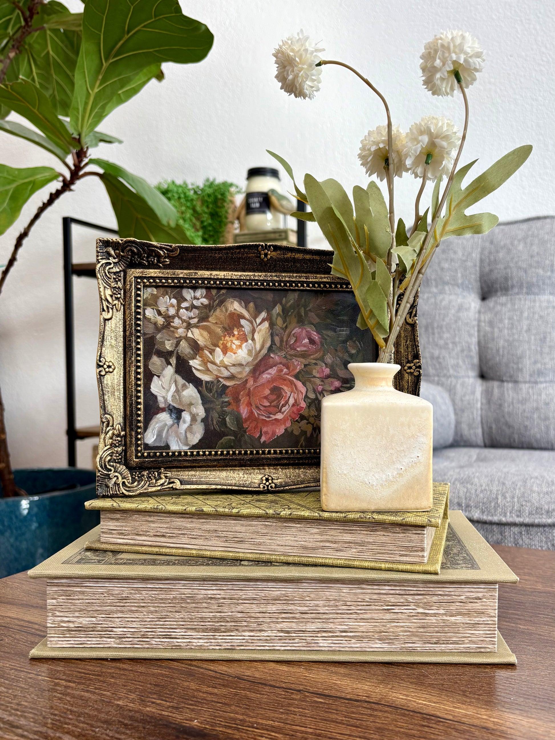 Stack both vintage books for literary foundation, position the floral art for romantic depth, display the square vase with white thistle for clean elegant simplicity, and keep everything understated - the beauty is in the restraint and thoughtful curation, not in abundance.