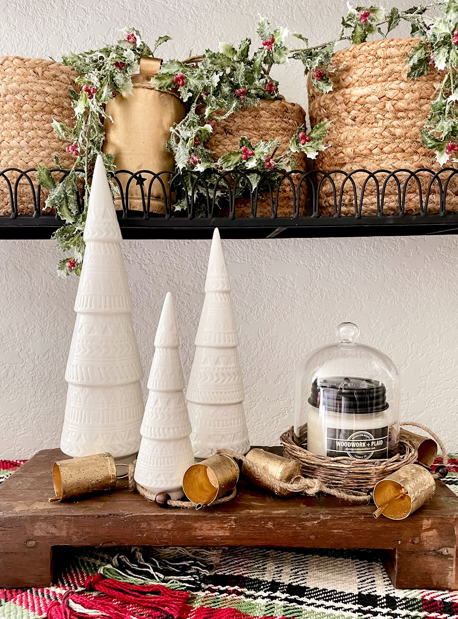 Use the wood riser as your foundation, arrange the embossed trees at varying heights like a pristine forest, place the cloche to highlight your glowing candle, and add the brass bells for metallic shimmer and gentle holiday sound.